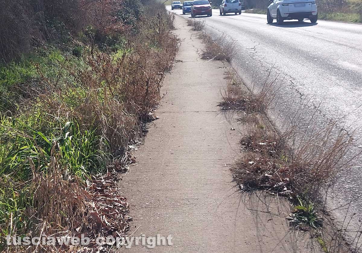 Viterbo – Un cammino che per molti dovrebbe essere di cura e sollievo, si trasforma ogni giorno in un percorso ai limiti della praticabilità. Parliamo del tratto pedonale che dalla rotonda sulla via Teverina porta verso il centro geriatrico Giovanni XXIII, un percorso fatto quotidianamente da anziani, disabili e dalle loro famiglie.