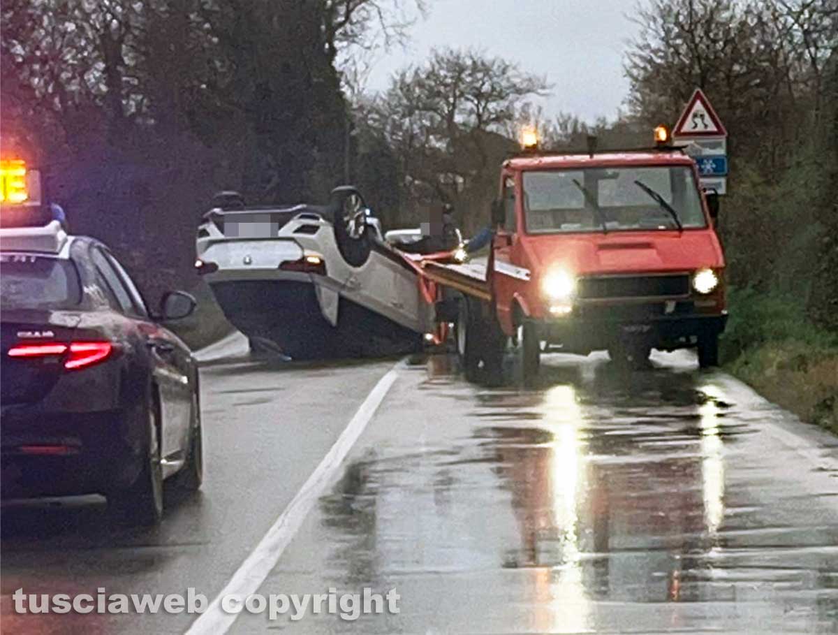 Tuscania – Cappotta sulla Tarquiniese, l’auto finisce di traverso sulla carreggiata. Sul posto carabinieri e 118.