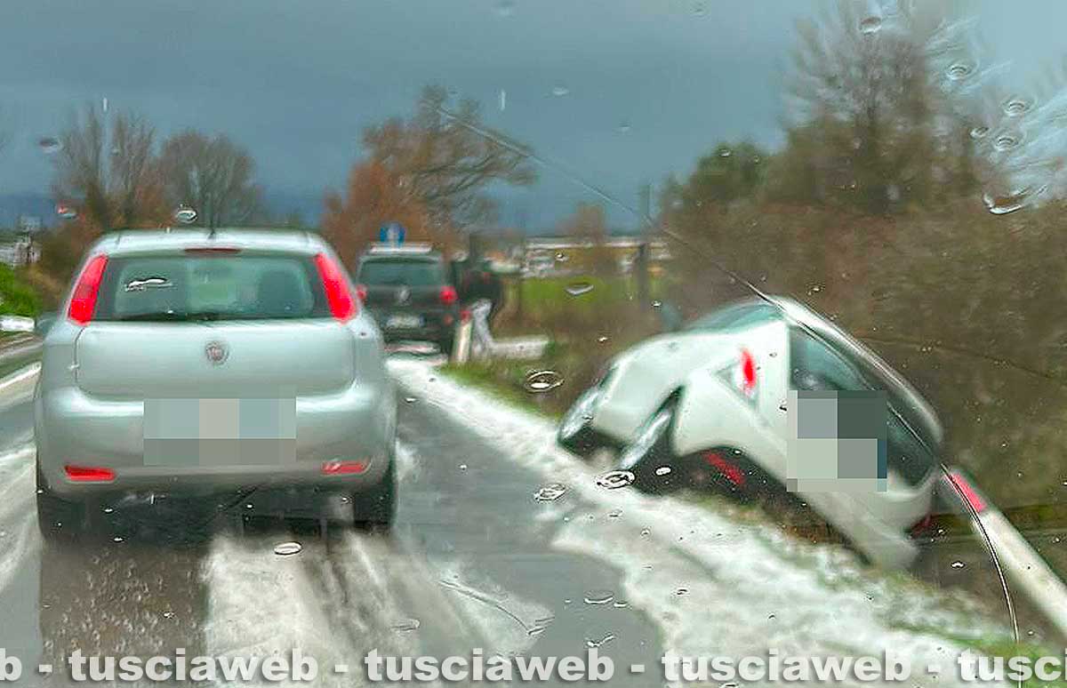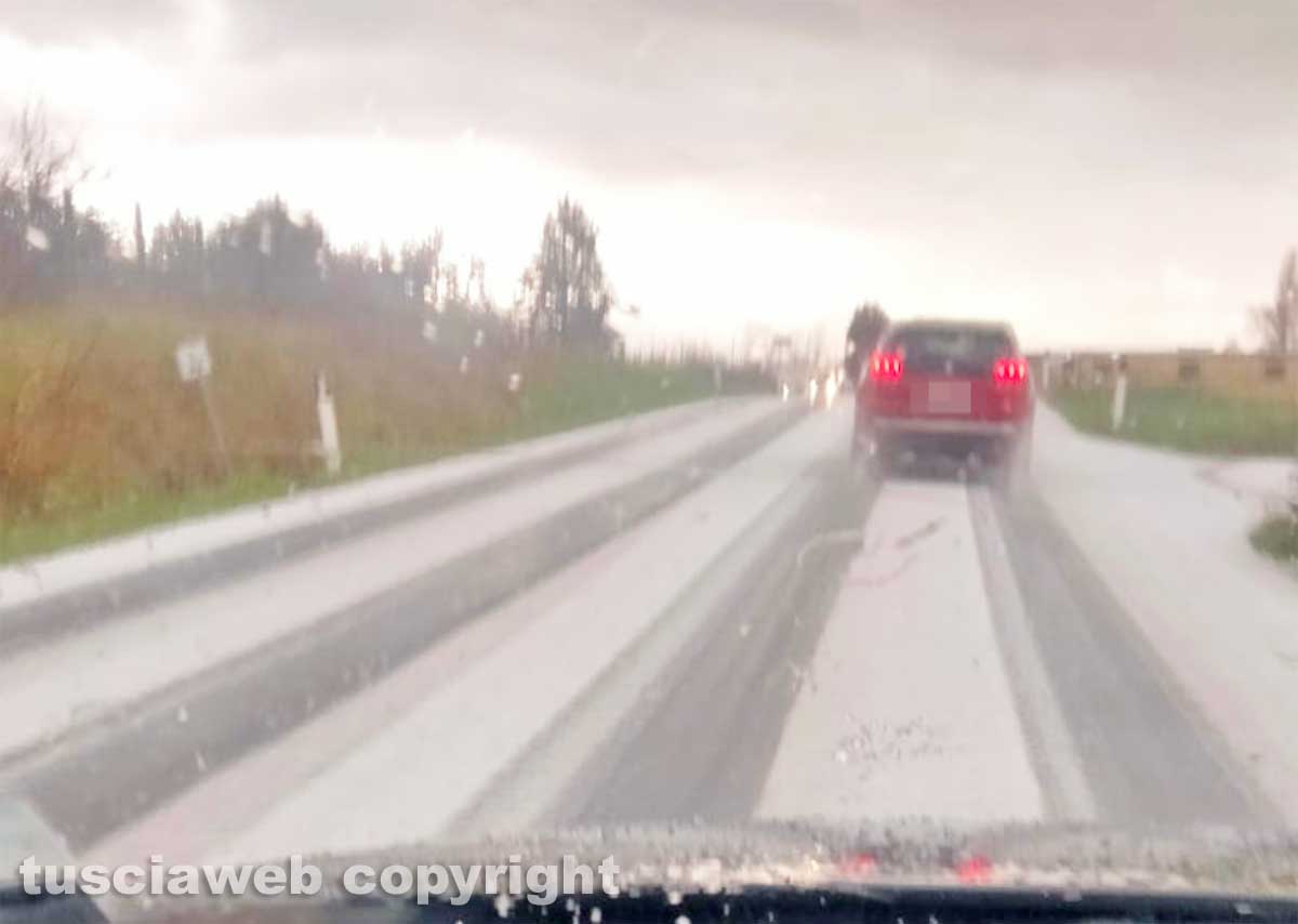 Montefiascone – Grandinata a Montefiascone, si imbianca la Cassia Nord. Manto stradale ricoperto, le raccomandazioni degli automobilisti: “Fate attenzione”.