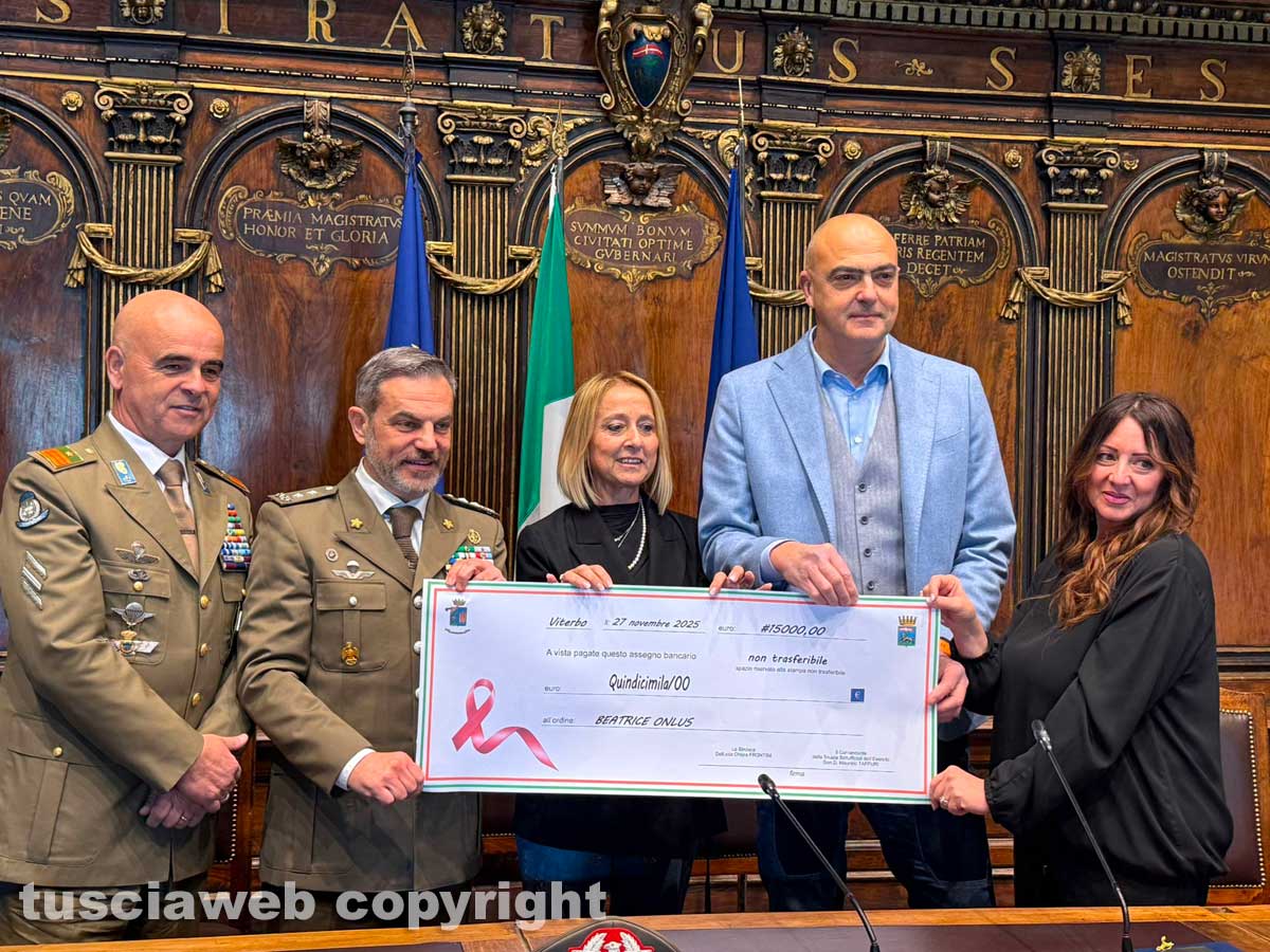 Viterbo – “Con questo contributo otto donne malate di tumore inizieranno una terapia di agopuntura”. Donatella Salvatori dell’associazione Beatrice onlus stamattina alla cerimonia di consegna dei fondi raccolti al concerto della banda musicale dell’Esercito italiano lo scorso 27 novembre al teatro dell’Unione.