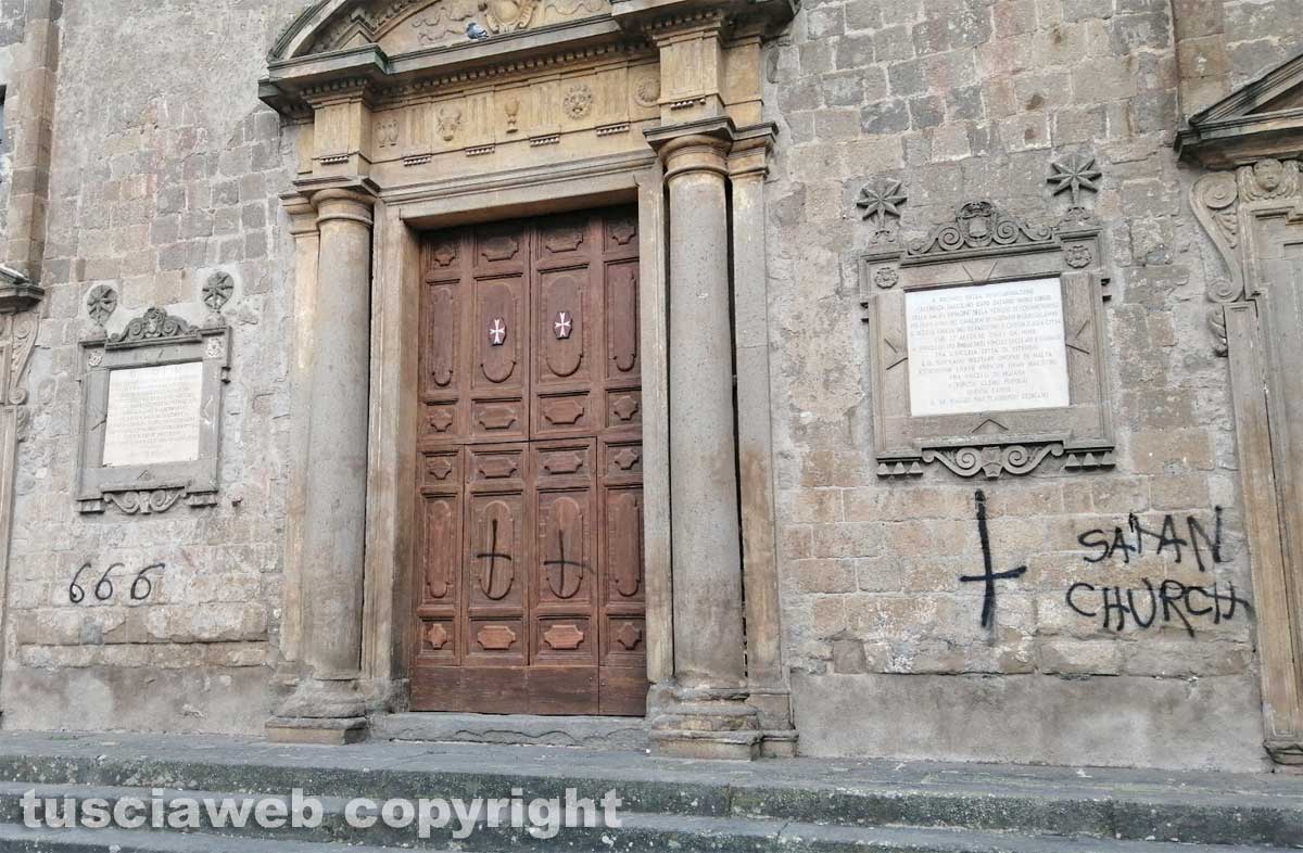 Nella foto: Viterbo - Scritte sataniche, Emanuele Joppolo ha iniziato stamattina il lavoro di restauro sulla chiesa di San Faustino