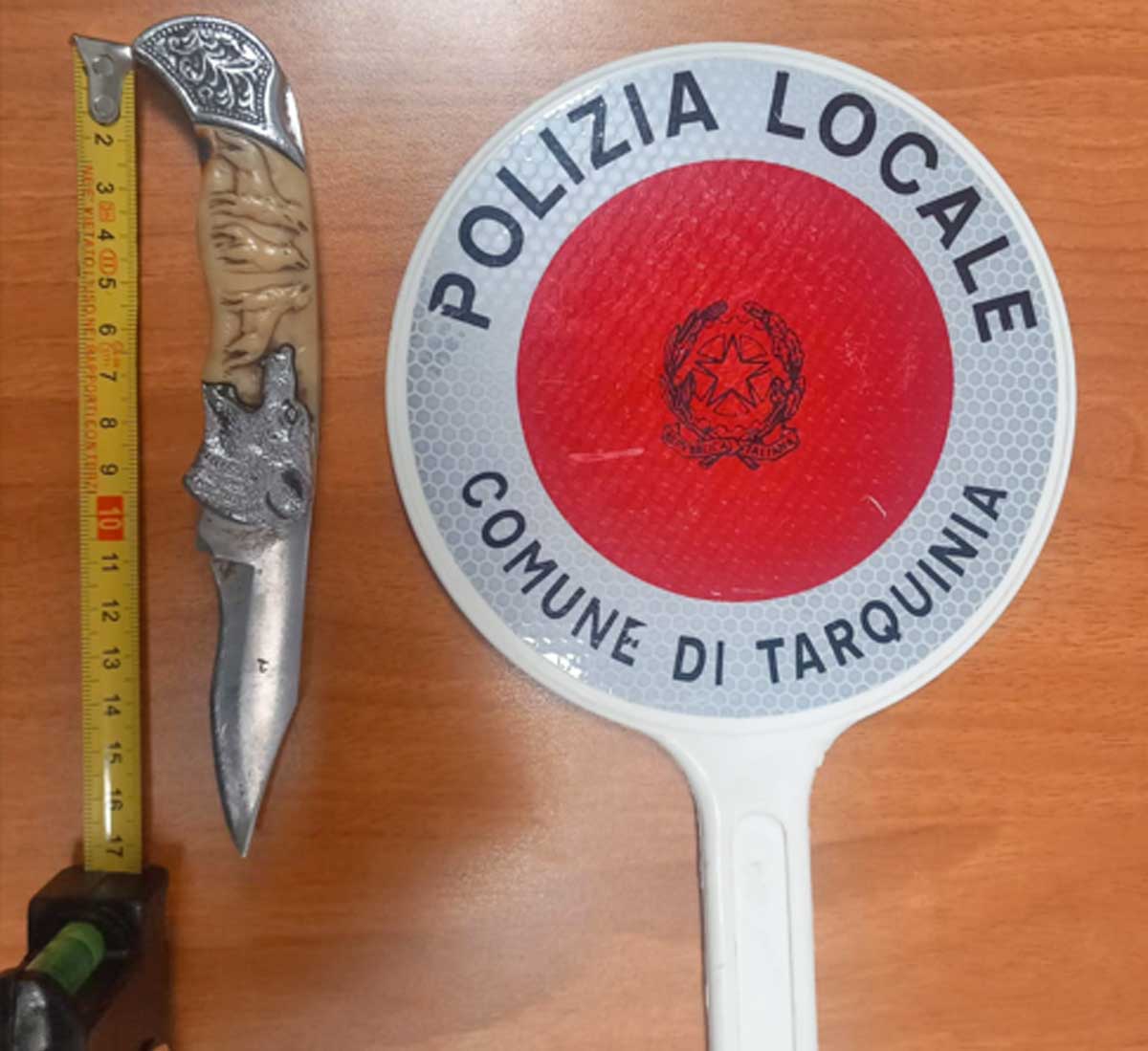 Nella foto: Tarquinia - Polizia locale - Il coltello sequestrato