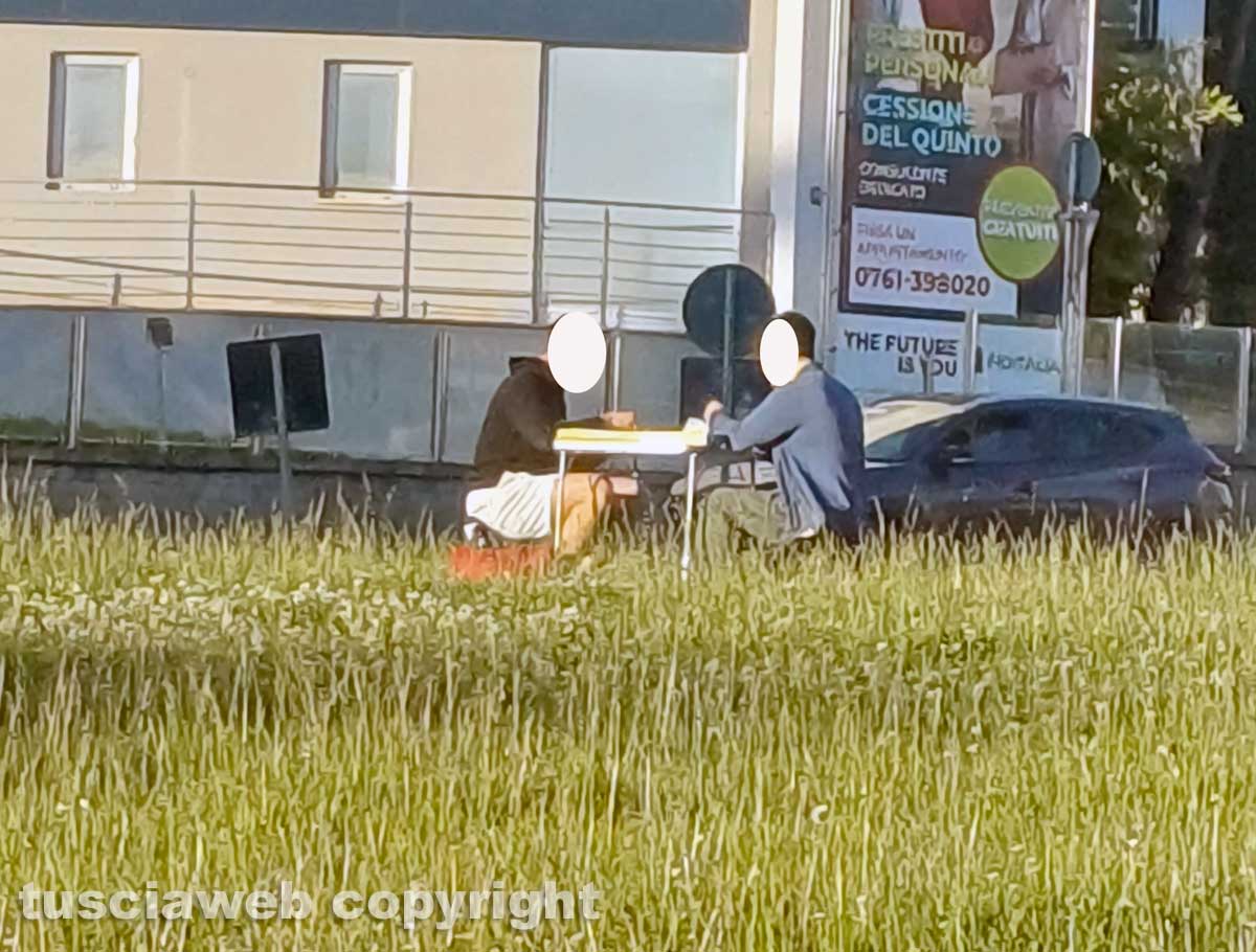 Viterbo – “25 aprile alternativo, due ragazzi fanno il pic-nic sulla rotatoria dell’Ipercoop”. La segnalazione di Roberta De Angelis.