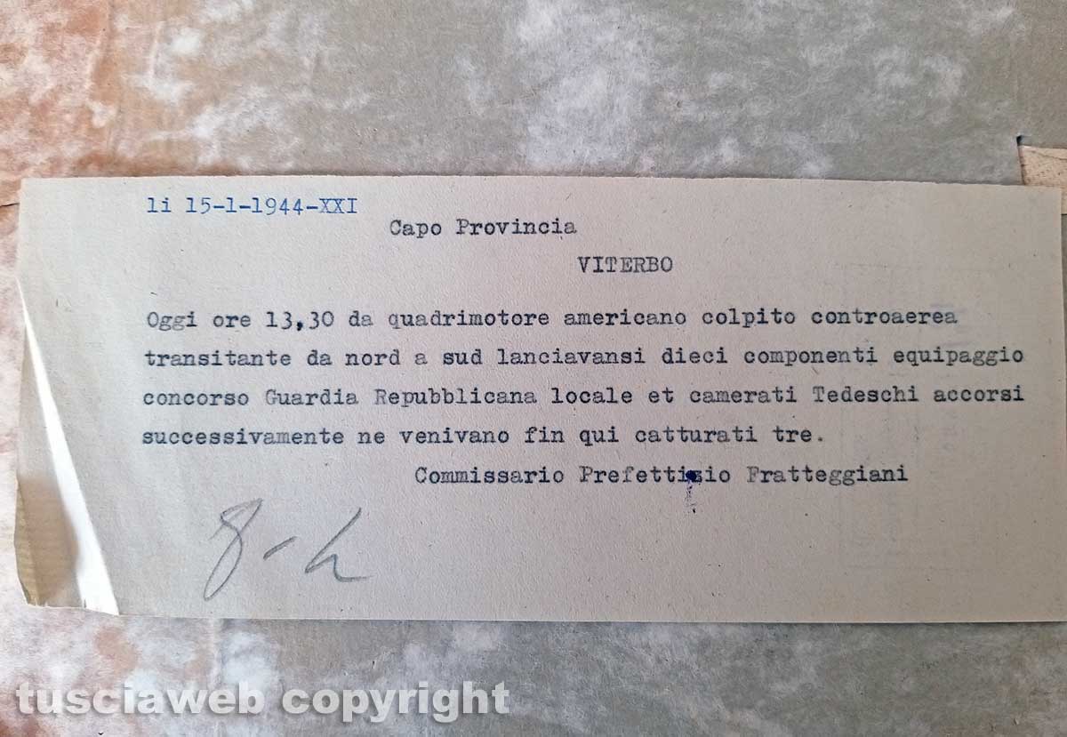 Graffignano – “15 gennaio 1944: dieci aviatori si sono paracadutati da un quadrimotore americano colpito, tre sono stati catturati”. È quanto riportato in un documento ritrovato nell’archivio storico del Comune di Graffignano.