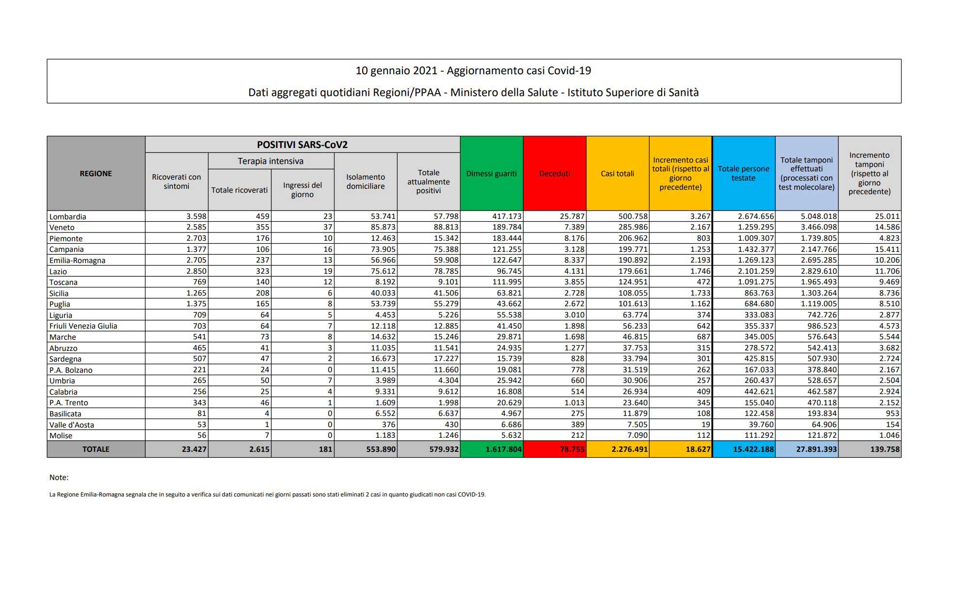 Coronavirus – Il bollettino del ministero della Salute del 10 gennaio