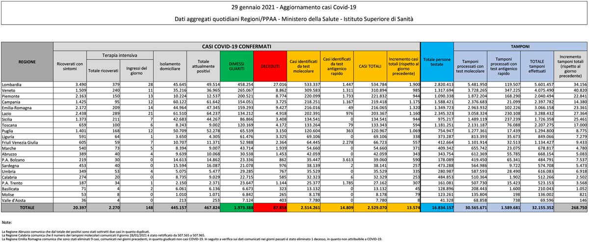 Coronavirus – Il bollettino del ministero della Salute del 29/01/2021