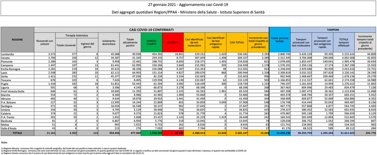 Coronavirus – Il bollettino del ministero della Salute del 27/01/2021