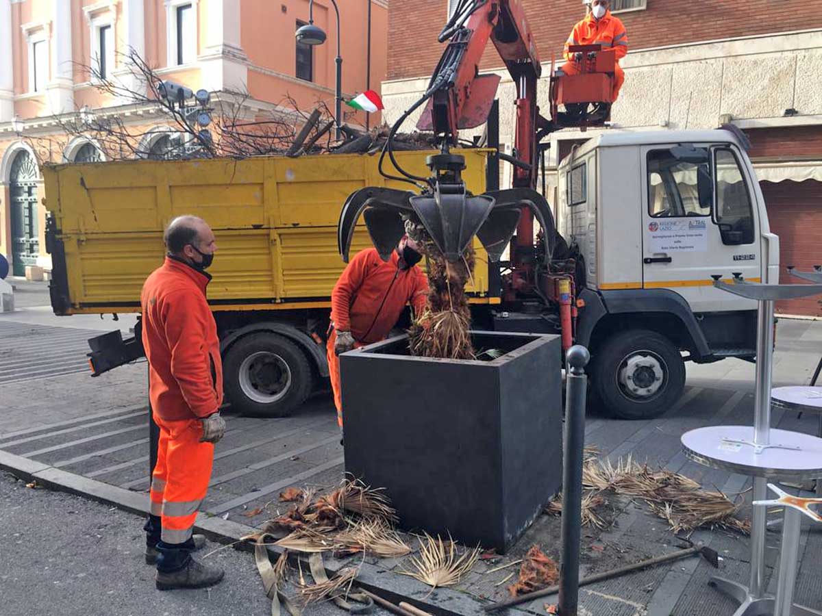 Lungo l’asse di viale Garibaldi e lungomare de Revel si provvederà, parimenti, alla sostituzione degli esemplari arborei secchi con specie resistenti al punteruolo rosso e con la messa a dimore di essenze floreali.