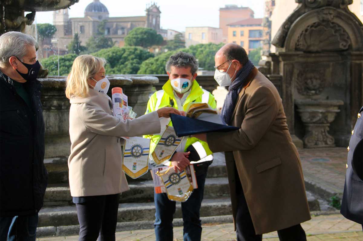 Al termine scambio di doni e gagliardetti, mentre Alessandra Croci ha donato al Rotary club Viterbo un manufatto in ceramica zaffera, realizzato da Cinzia Chiulli con il logo rotariano e quello della Via Frangigena. Il sindaco ha poi accompagnato gli ospiti nel suo studio, per mostrare le sale e raccontare storia e tradizioni viterbesi.