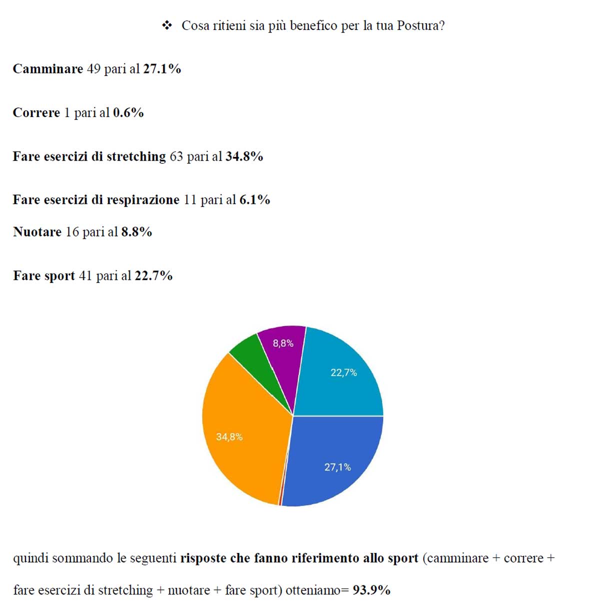 Alla domanda “cosa ritieni sia più benefico per la tua postura?”, sommando le varie alternative offerte come “camminare”, “correre”, “nuotare” eccetera, il 93,9% degli intervistati concentra la sua risposta su attività chiaramente afferenti allo sport.