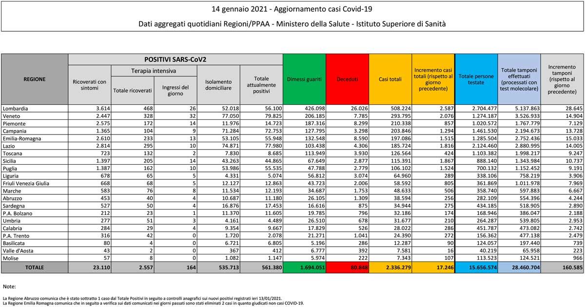 Coronavirus – Il bollettino del ministero della Salute del 14/01/2021