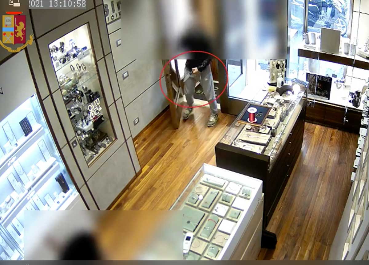 Ad avvalorare l’ipotesi investigativa la comparazione fra il fermo immagine del rapinatore e la fotografia contenuta nel sistema S.A.R.I., in uso alle forze dell’ordine. La compiuta identificazione del giovane è poi avvenuta attraverso le impronte lasciate da questi sul alcune superfici in vetro della gioielleria, repertate dagli agenti del Gabinetto Interregionale di Polizia Scientifica nel corso del sopralluogo.