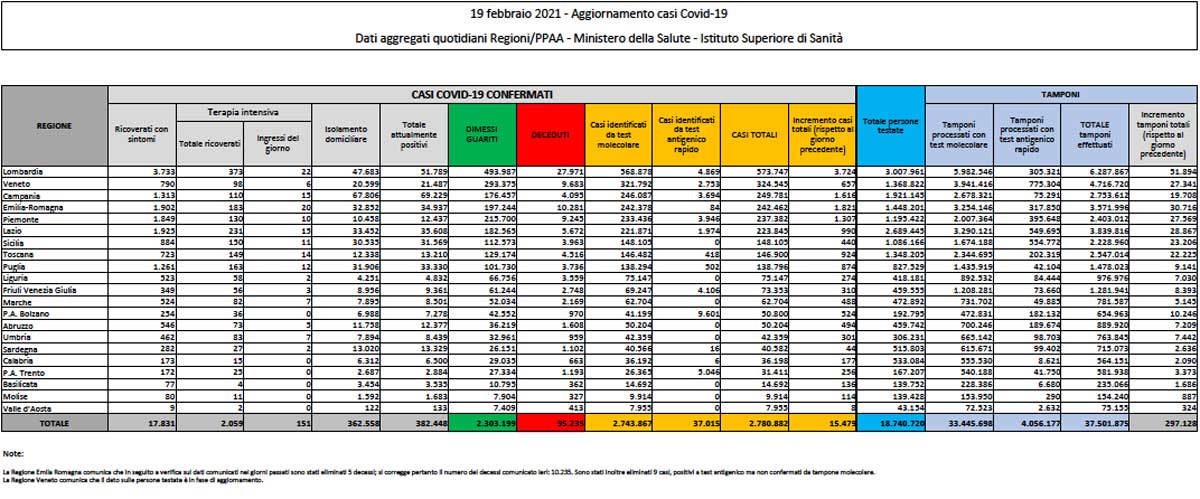 Emergenza Covid – Il bollettino del 19 febbraio del ministero della Salute