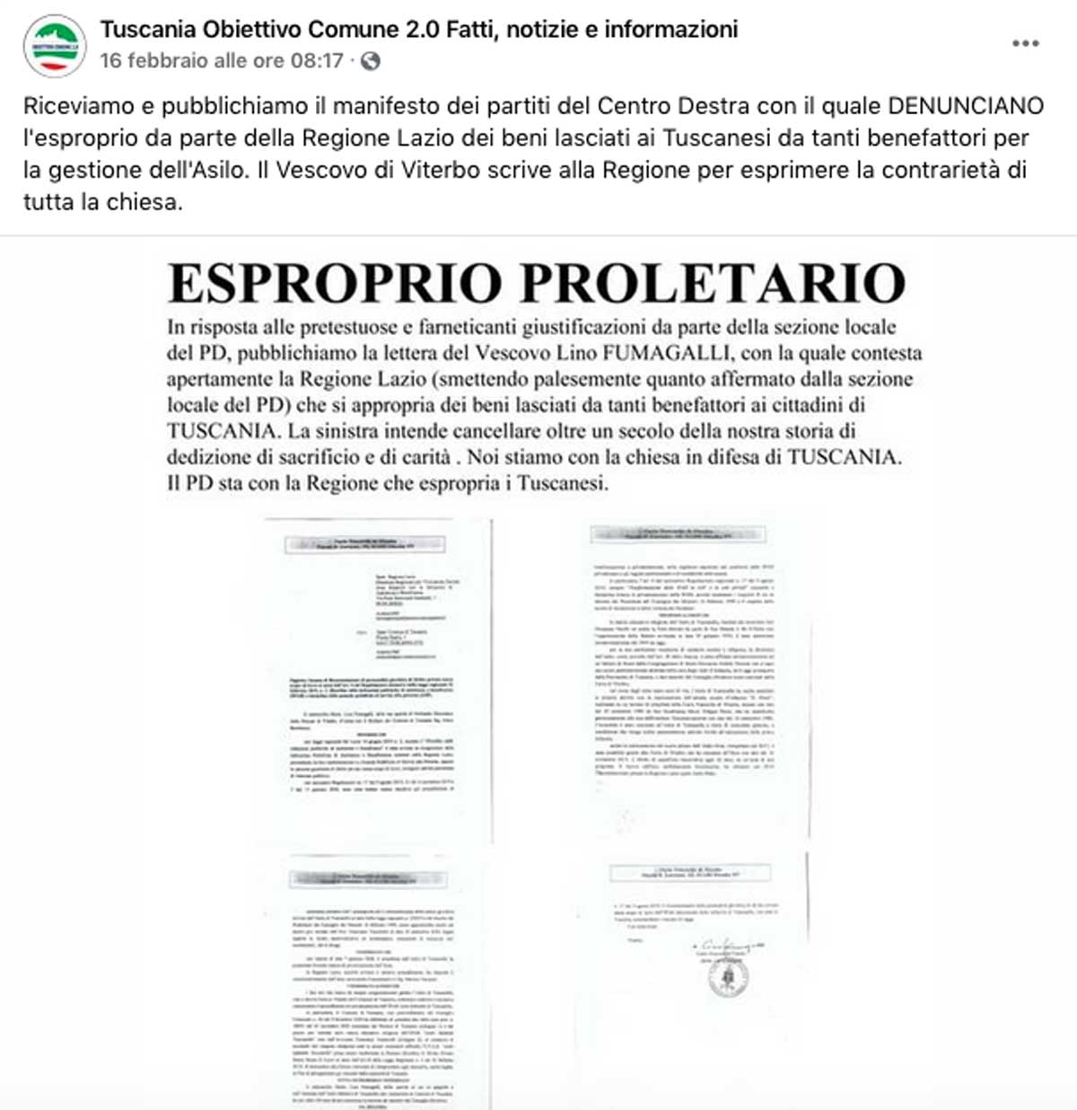 Il testo della lettera è stato pubblicato sulla pagina Facebook dell’amministrazione, così come il manifesto dei partiti del centrodestra con cui “denunciano – si legge nel post – l’esproprio da parte della Regione Lazio dei beni lasciati ai Tuscanesi da tanti benefattori per la gestione dell’Asilo” e sottolineano appunto: “il vescovo di Viterbo scrive alla Regione per esprimere la contrarietà di tutta la chiesa”.