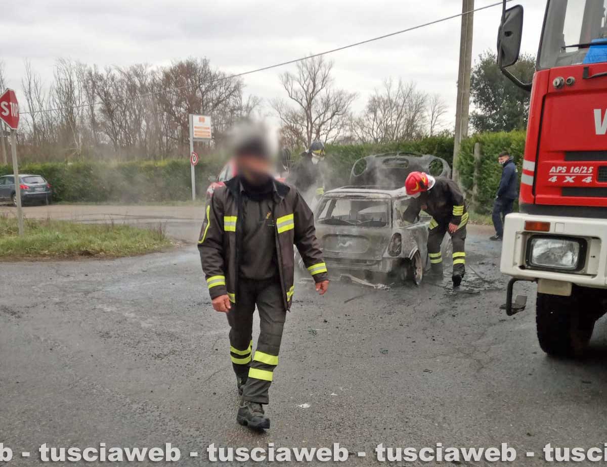 La vettura è andata in fiamme sulla Cassia Nord, al chilometro 88,600. Si tratta di una Mini.