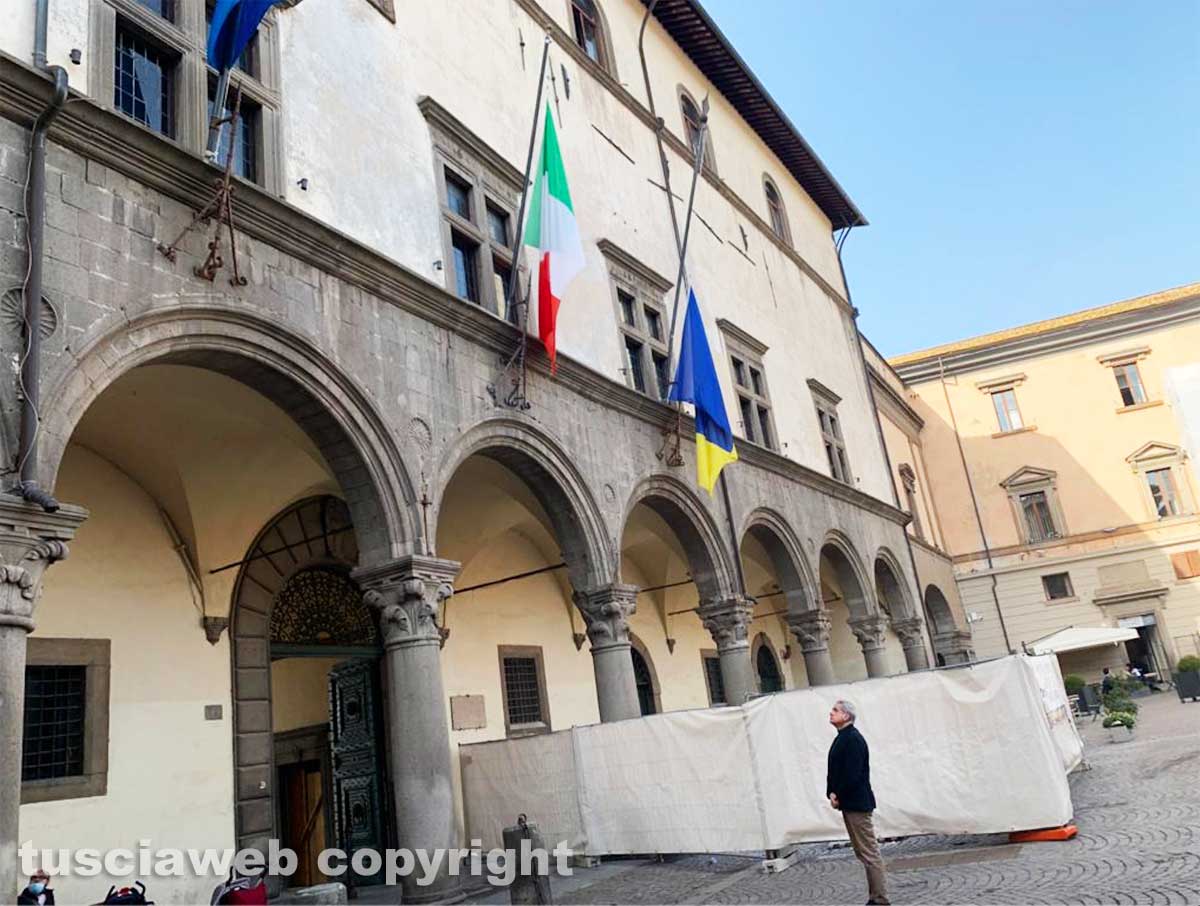 Viterbo – Bandiere a mezz’asta a Palazzo dei Priori. In segno di lutto. Per l’uccisione dell’ambasciatore italiano in Congo Luca Attanasio, 43 anni, del carabiniere Vittorio Iacovacci, 30 anni, e dell’autista del convoglio del World Food Programme Mustapha Milambo. Un’iniziativa dell’Anci, l’associazione nazionale dei comuni. Ha aderito anche Viterbo.