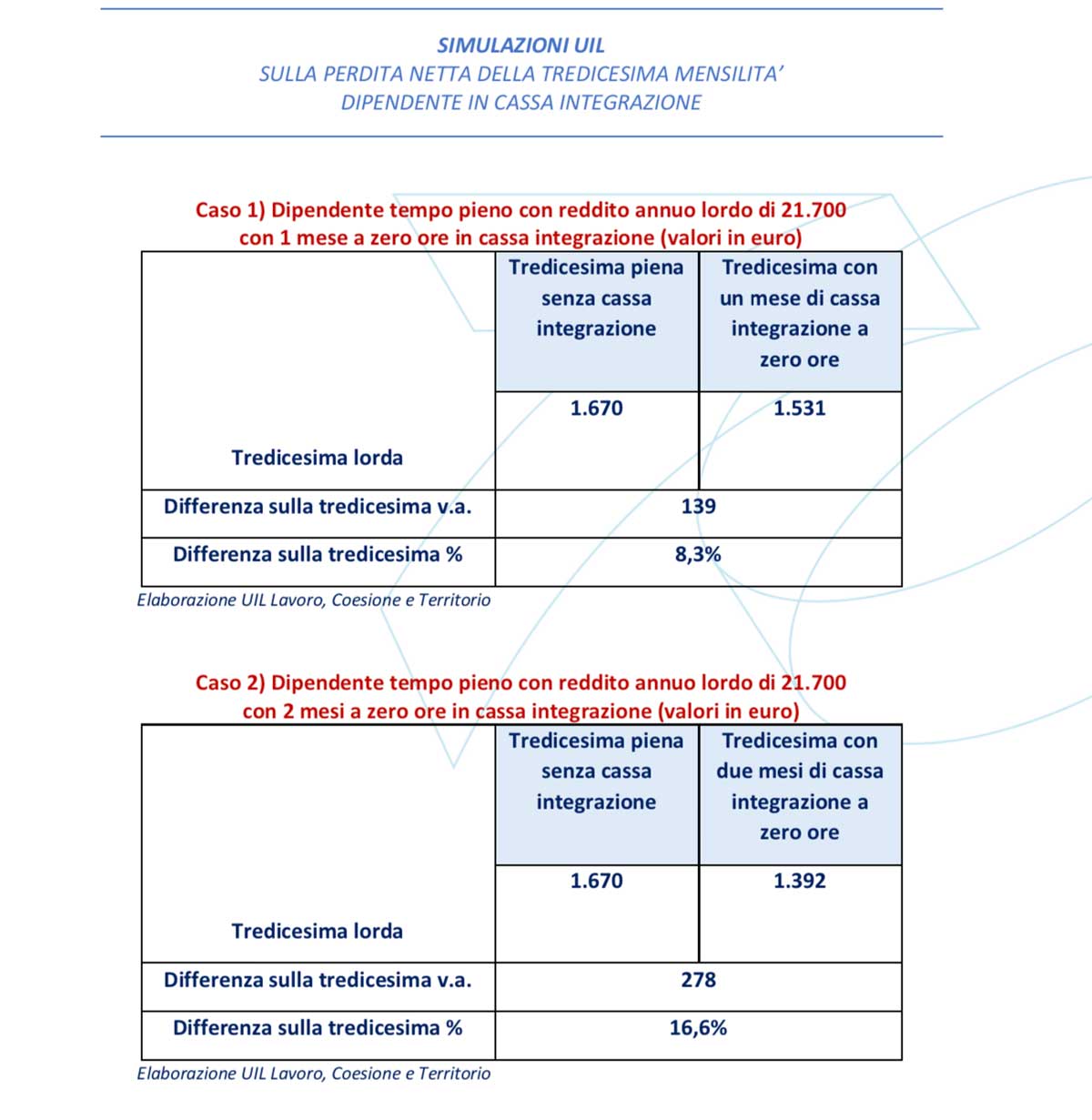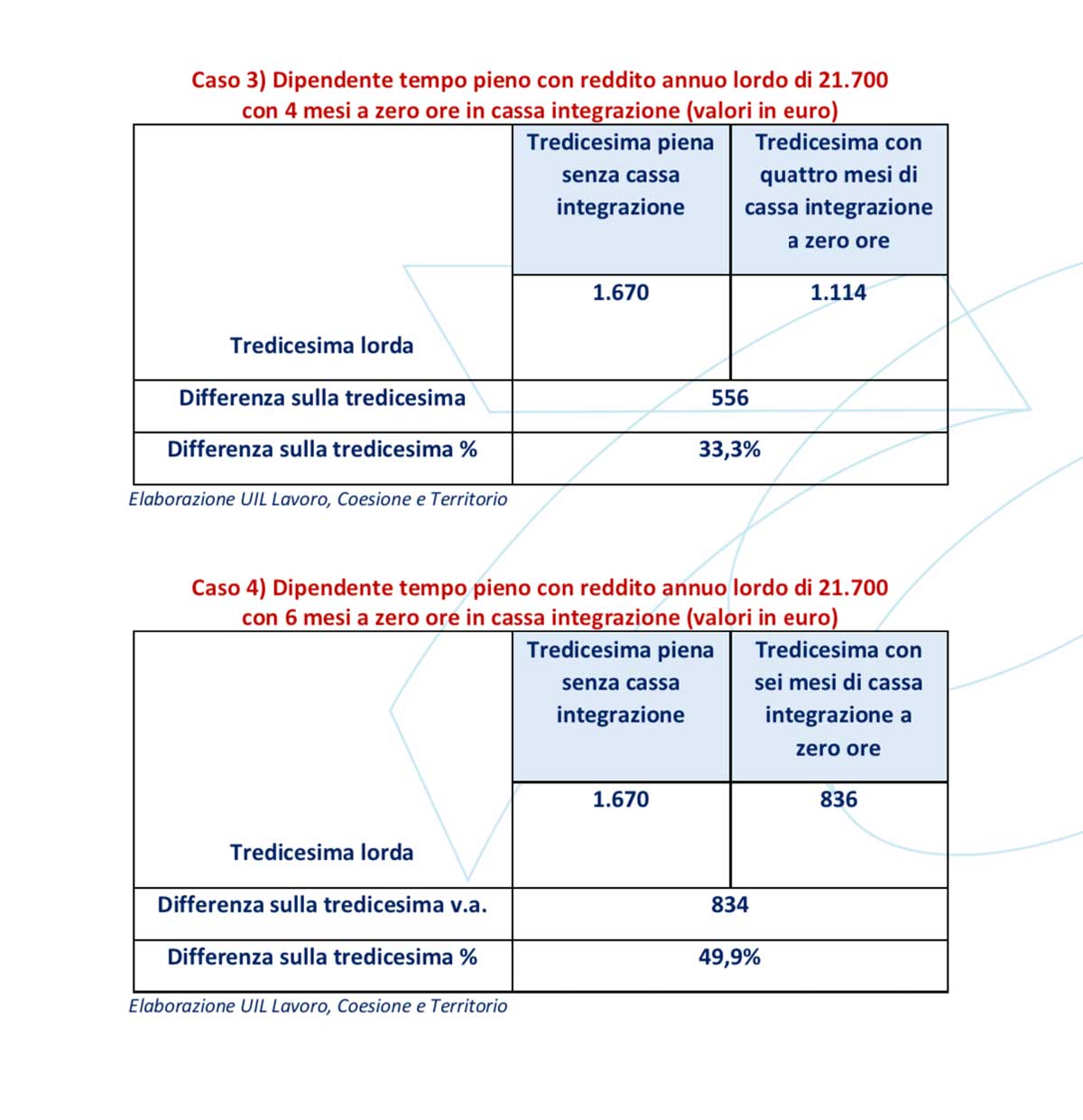 Quindi, secondo l’analisi fatta dal sindacato, su un reddito lordo di 21.700 euro, mediamente, stando in cassa integrazione, la mancata maturazione di un rateo della tredicesima ammonta a 139 euro medi pro capite, l’8,3% dell’importo, su un importo lordo della tredicesima pari a 1.670 euro.