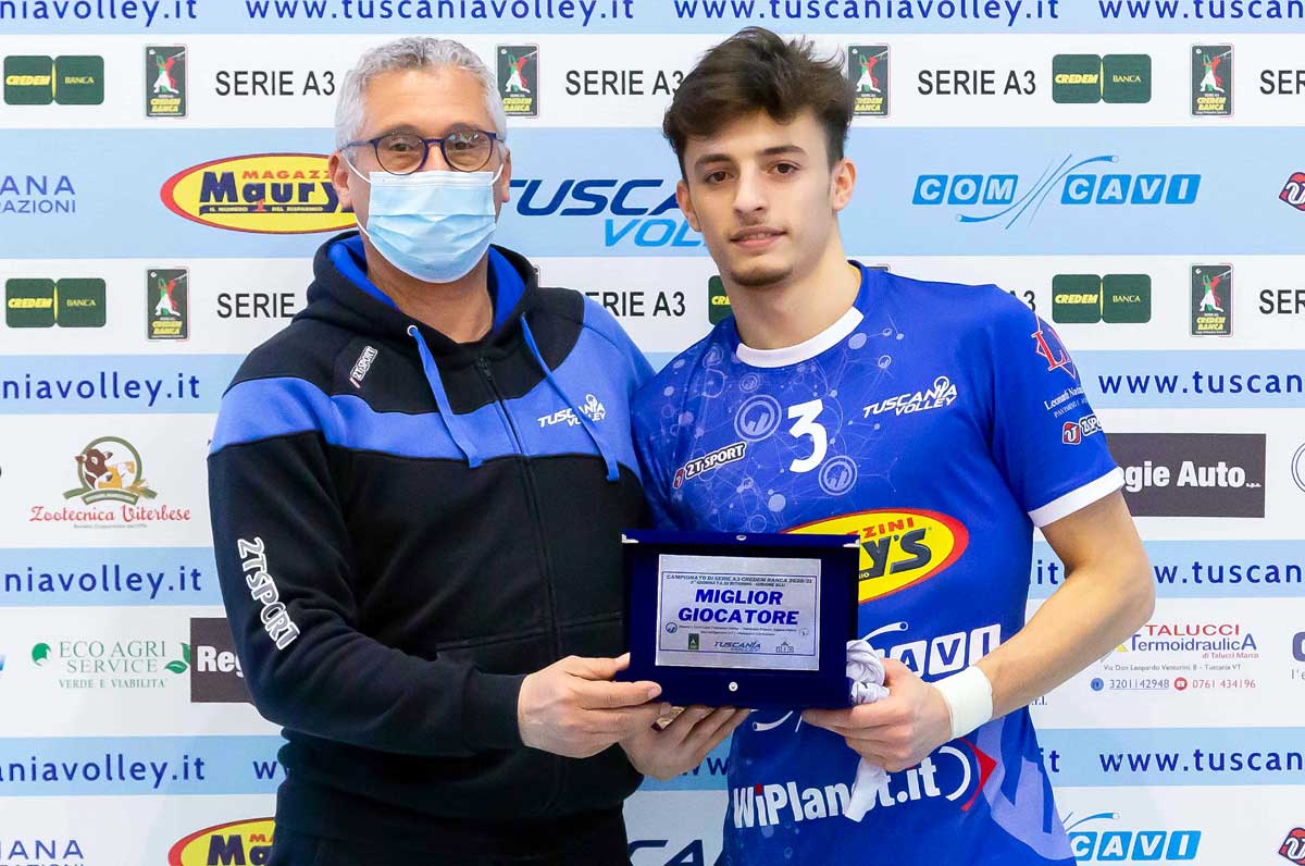 MVP: Sebastiano Marsili, premiato dal presidente del Tuscania Volley, Angelo Pieri.