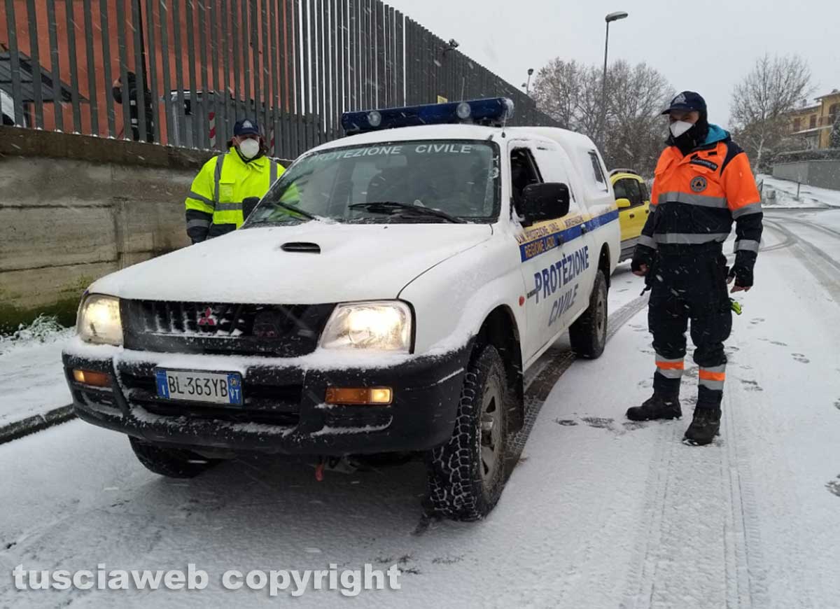 La protezione civile di Montefiascone è intervenuta in tutto il territorio con il camion Scam attrezzato con lama sgombraneve e con lo spargisale, e con due mezzi (Panda e jeep).