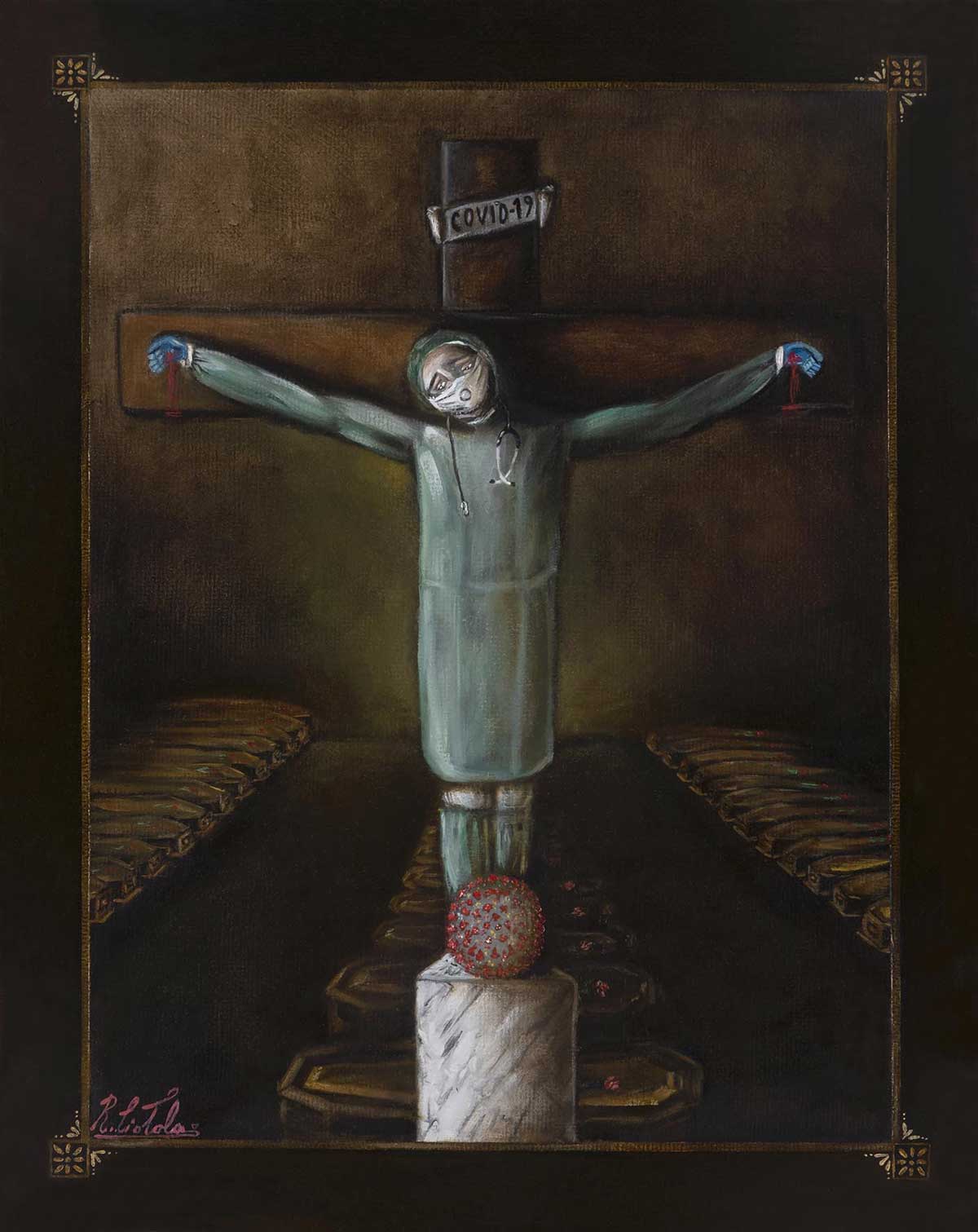 Una grande croce svetta in primo piano con sopra l’iscrizione Covid-19 al posto dell’acronimo Inri. Al posto di nostro Signore vediamo crocefissa una persona. Non è né donna né uomo: è un essere umano, simbolo di tutti gli operatori sanitari che si sono sacrificati durante la pandemia per salvare, no di certo l’umanità intera, ma sicuramente quanti erano finiti sotto le loro cure.