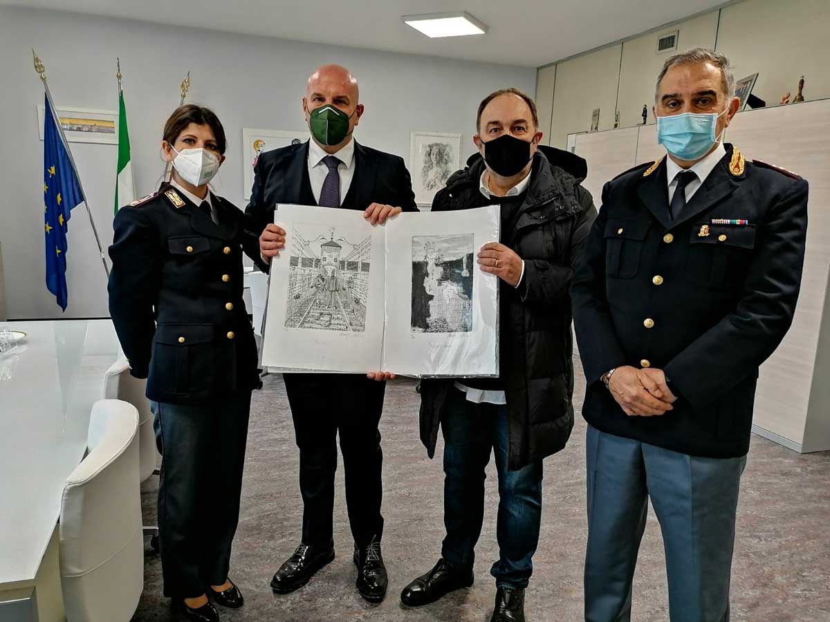 Artista versatile e sensibile, profondo conoscitore della storia italiana del ‘900, anche per esperienze familiari, il maestro Zavoli ha donato al questore due sue incisioni, due opere d’arte calcografiche, che rappresentano le grandi tragedie che hanno contrassegnato il secolo scorso: un’acquaforte che rappresenta l’Olocausto, utilizzata come manifesto del docu-film “27 gennaio Giorno della memoria – Michelangelo Onigi – la nostra storia” e, in occasione del Giorno del ricordo, un’acquaforte/acquatinta che rappresenta la tragedia degli infoibati.