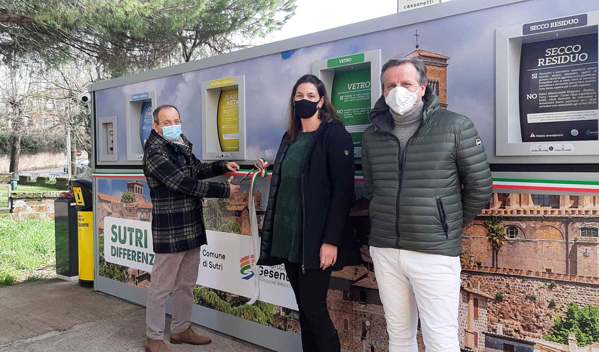 Sutri – Riceviamo e pubblichiamo – Inaugurate questa mattina due ecoisole informatizzate per il conferimento del secco residuo, plastica e metalli, carta e cartone, organico e vetro alla presenza del vice sindaco del comune di Sutri Luigi Di Mauro, il consigliere con delega all’Ambiente del comune di Sutri Barbara Pancino e il direttore operativo Gesenu Massimo Pera.