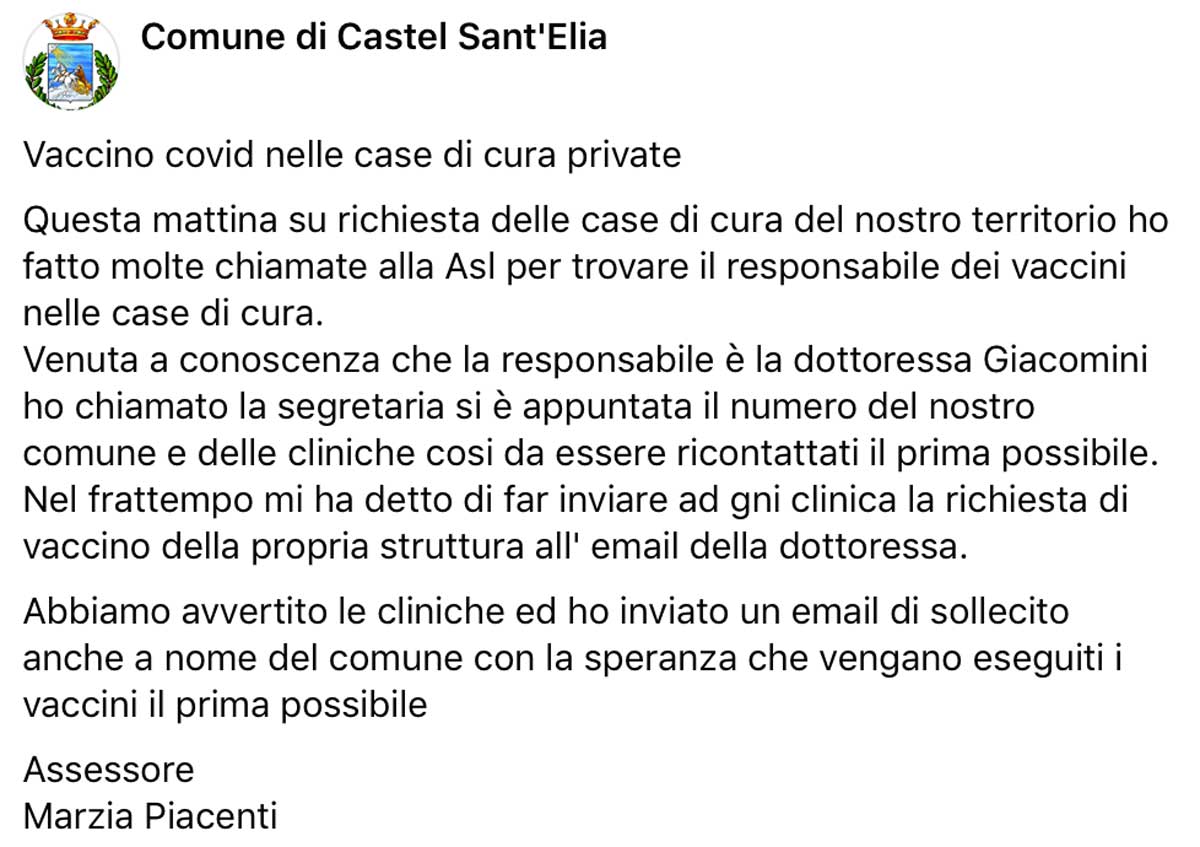 Viterbo – “Venite a vaccinare gli anziani delle nostre Rsa”. L’appello, rivolto alla Asl di Viterbo, arriva dal comune di Castel Sant’Elia.