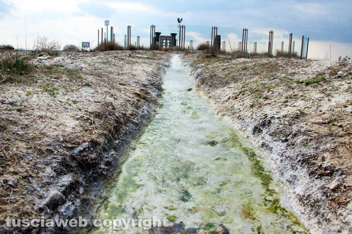 Il Bullicame, sta scritto su uno dei pannelli all’ingresso, è “un sito di rilevante interesse paesaggistico, storico e monumentale per la città di Viterbo, già noto agli etruschi e ai romani per l’uso delle acque termali a fini terapeutici e nel medioevo anche per le attività di macerazione della canapa e del lino, tanto che Dante per ben tre volte lo cita beni canti dell’Inferno. A partire dalla metà del XIII secolo e fino al XIX l’intera area ebbe un ruolo rilevante sull’economia cittadina. Cesare Pinzi, nel 1905, la descrive come una collinetta biancastra e nuda d’ogni vegetazione che domina la piana di Viterbo con un pennacchio di fumo proveniente da un laghetto bollente di colore ceruleo che corona il vertice della collina”.