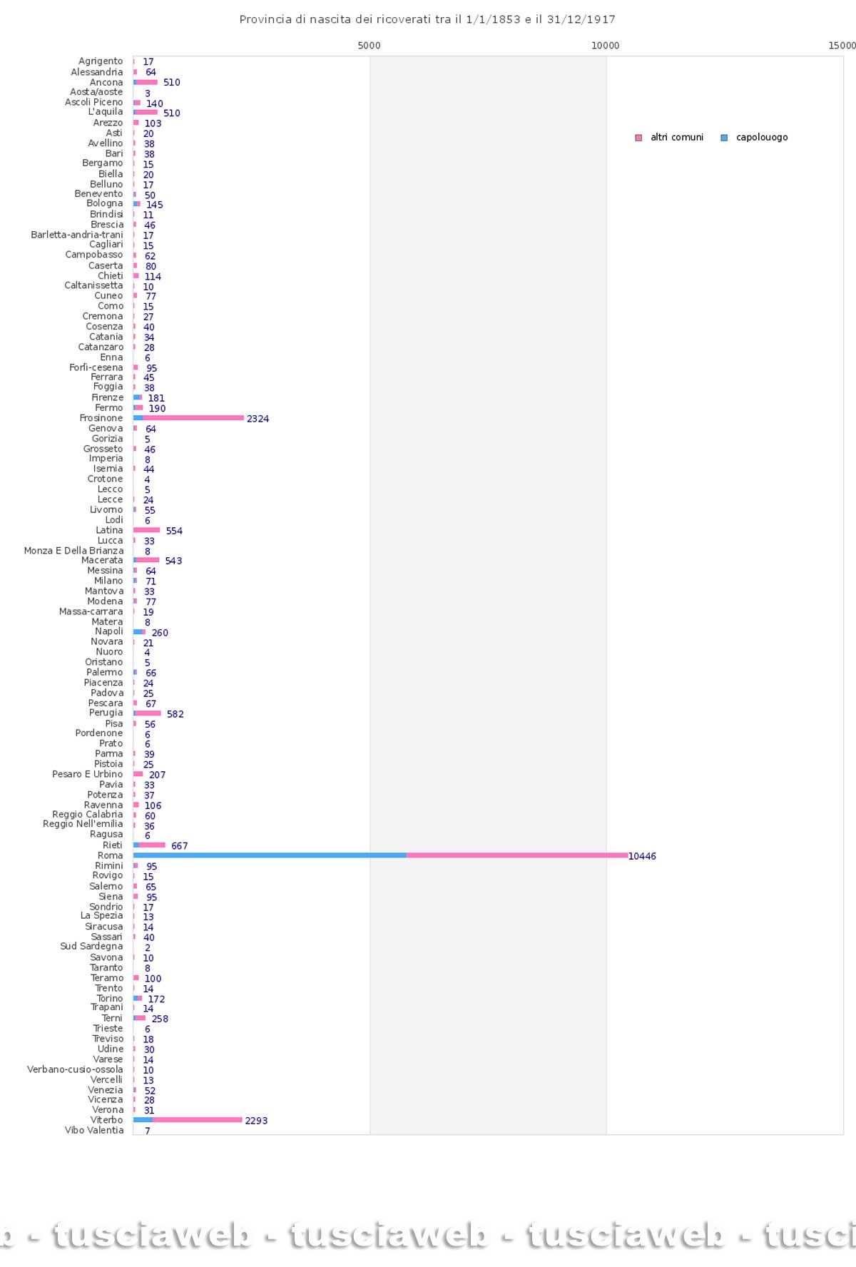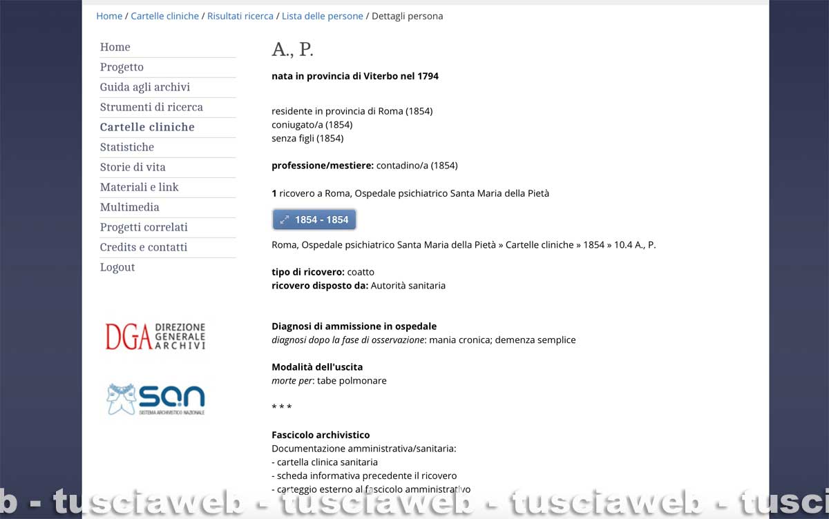 La storia più in là nel tempo riguarda invece una donna. A.P., nata in provincia di Viterbo nel 1794. Contadina, sposata e senza figli. Ricoverata dall’autorità sanitaria nel 1854. Diagnosi, “mania cronica e demenza semplice”. Morta lo stesso anno per “tabe polmonare”, malattia cronica degenerativa che colpisce gli organi.