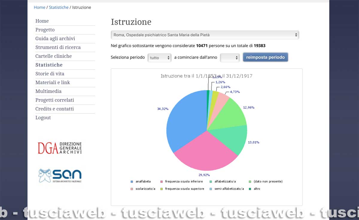 Scendendo nel dettaglio del sito Mibact, a Santa Maria della Pietà i ricoveri duravano in media tra i 5 e i 10 anni (43% dei casi), mentre l’età del primo ingresso in manicomio oscillava tra i 20 e i 30 anni (22,3%). Il 34% delle persone rinchiuse nel manicomio romano era analfabeta, mentre il 30% aveva frequentato le elementari. La condizione economica dei ricoverati era invece, per il 45% di loro, povera. Misera per il 6,7%. La metà era celibe, il 39% sposata/o. Per quanto riguarda la professione, il 26% faceva il contadino, il 17% la casalinga e il 15% la “donna di casa”. Infine il termine del ricovero, con il 40% delle persone imprigionate a Santa Maria della Pietà uscite dal manicomio…da morte.