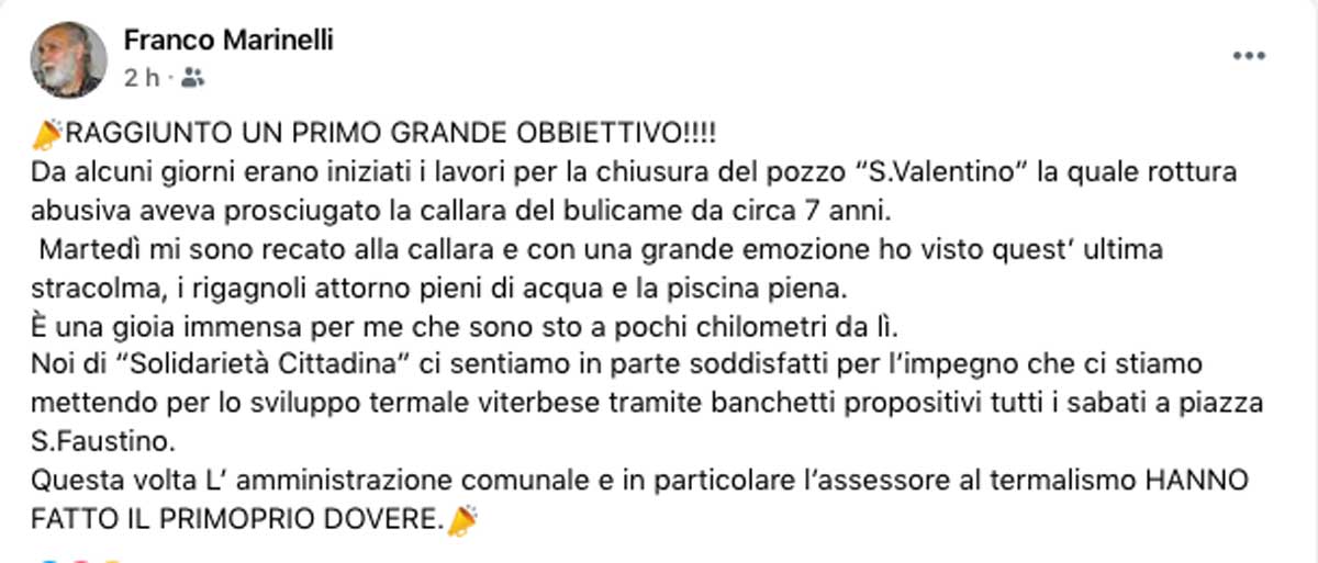 “Raggiunto un primo grande obiettivo – scrive Marinelli -. Da alcuni giorni erano iniziati i lavori per la chiusura del pozzo “San Valentino” la quale rottura abusiva aveva prosciugato la callara del bulicame da circa 7 anni.