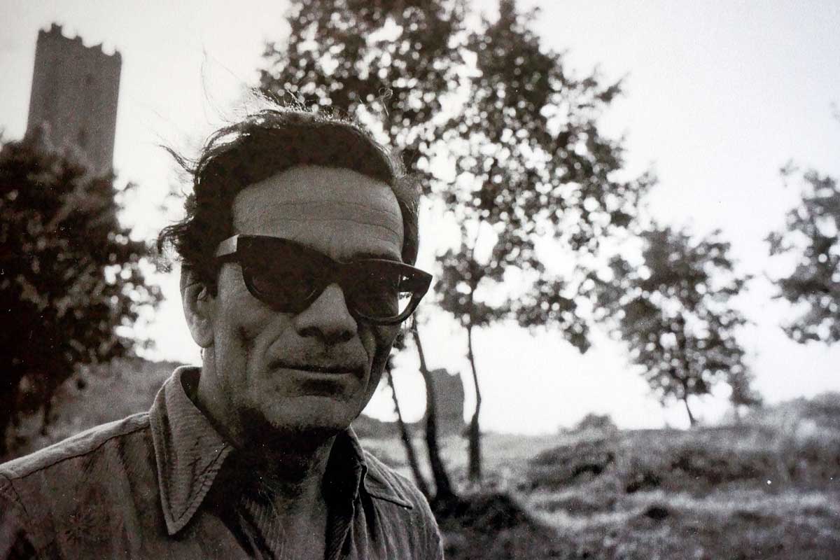 Pier Paolo Pasolini e sullo sfondo la torre di Chia