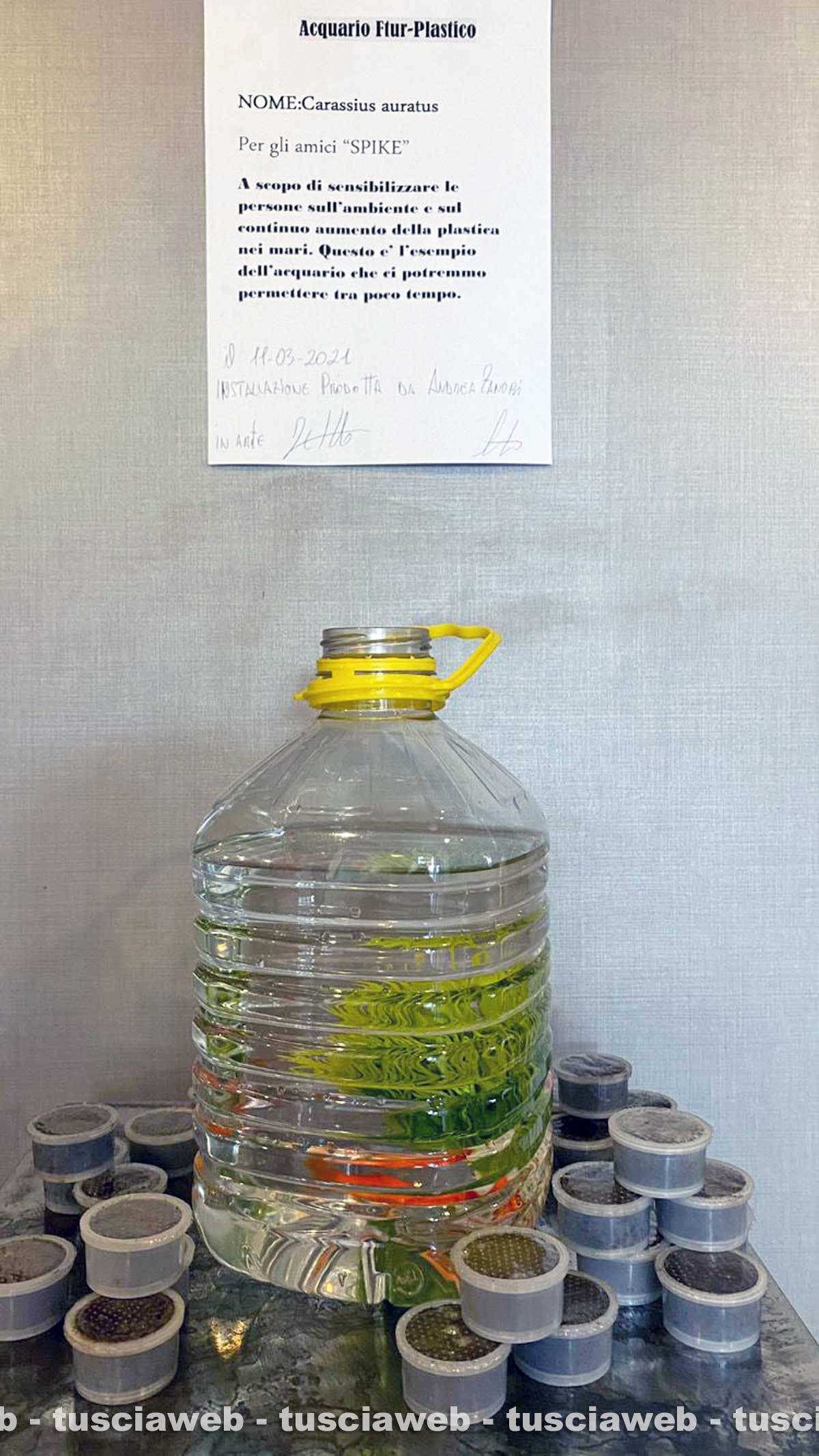 Con incursione-performance delle più garibaldine, nella speciale location di un ristorante del centro storico (il Tredici Gradi di Santa Maria Nuova), Andrea ha messo “Spike” a bagno per qualche ora in una tanichetta di plastica da cinque litri, circondandola con minacciose pile di cialde da caffè. Titolo della provocatoria operazione concettuale: “Acquario futur-plastico”. Il messaggio? Semplice e immediato.