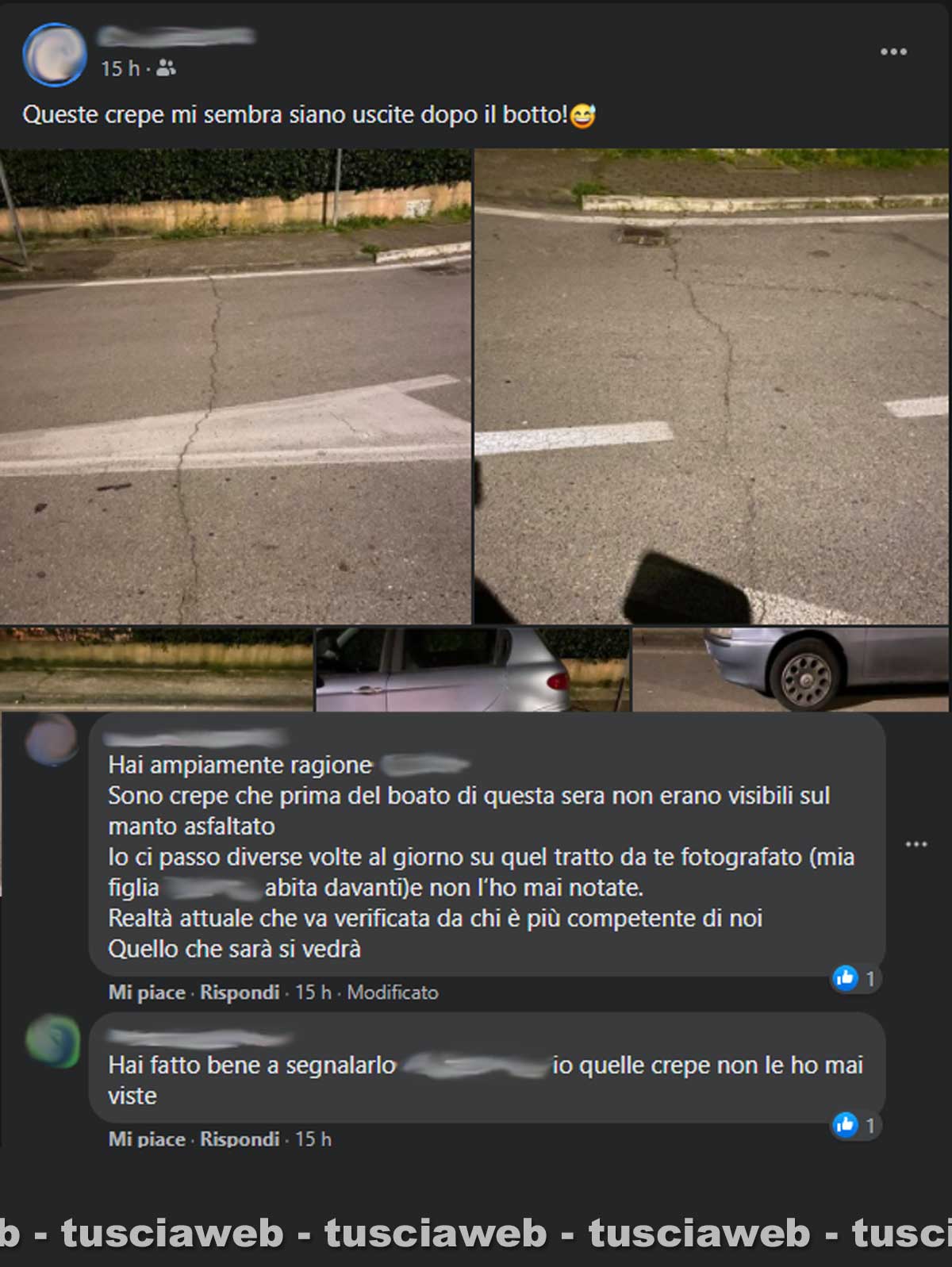 Ora anche le segnalazioni di crepe sull’asfalto, secondo i cittadini “mai viste prima” di mercoledì sera.