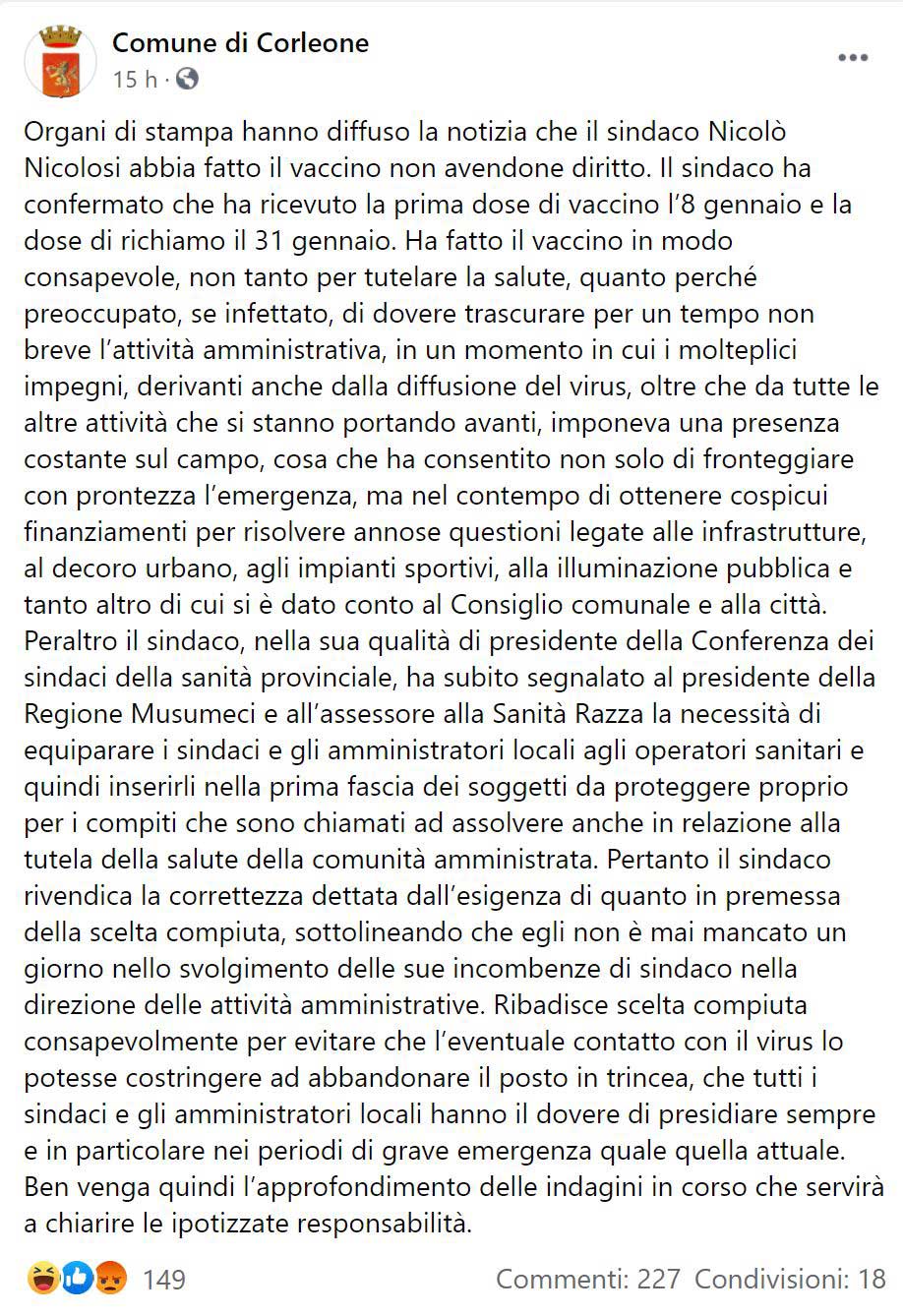 La difesa del sindaco era passata per un altro post pubblicato sulla pagina Facebook del comune. “Organi di stampa hanno diffuso la notizia che il sindaco Nicolò Nicolosi abbia fatto il vaccino non avendone diritto – si legge nel post -. Il sindaco ha confermato che ha ricevuto la prima dose di vaccino l’8 gennaio e la dose di richiamo il 31 gennaio. Ha fatto il vaccino in modo consapevole, non tanto per tutelare la salute, quanto perché preoccupato, se infettato, di dovere trascurare per un tempo non breve l’attività amministrativa, in un momento in cui i molteplici impegni, derivanti anche dalla diffusione del virus, oltre che da tutte le altre attività che si stanno portando avanti, imponeva una presenza costante sul campo”.