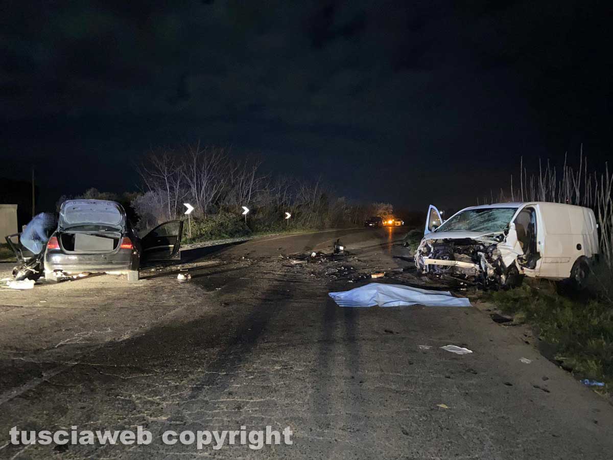 All’incirca un paio di chilometri dopo il bivio per le Terme dei Papi, per cause ancora da accertare, un’automobile Bmw 320 e un furgone Fiat Scudo si sono scontrati. La macchina procedeva verso Viterbo, il furgone verso Tuscania.