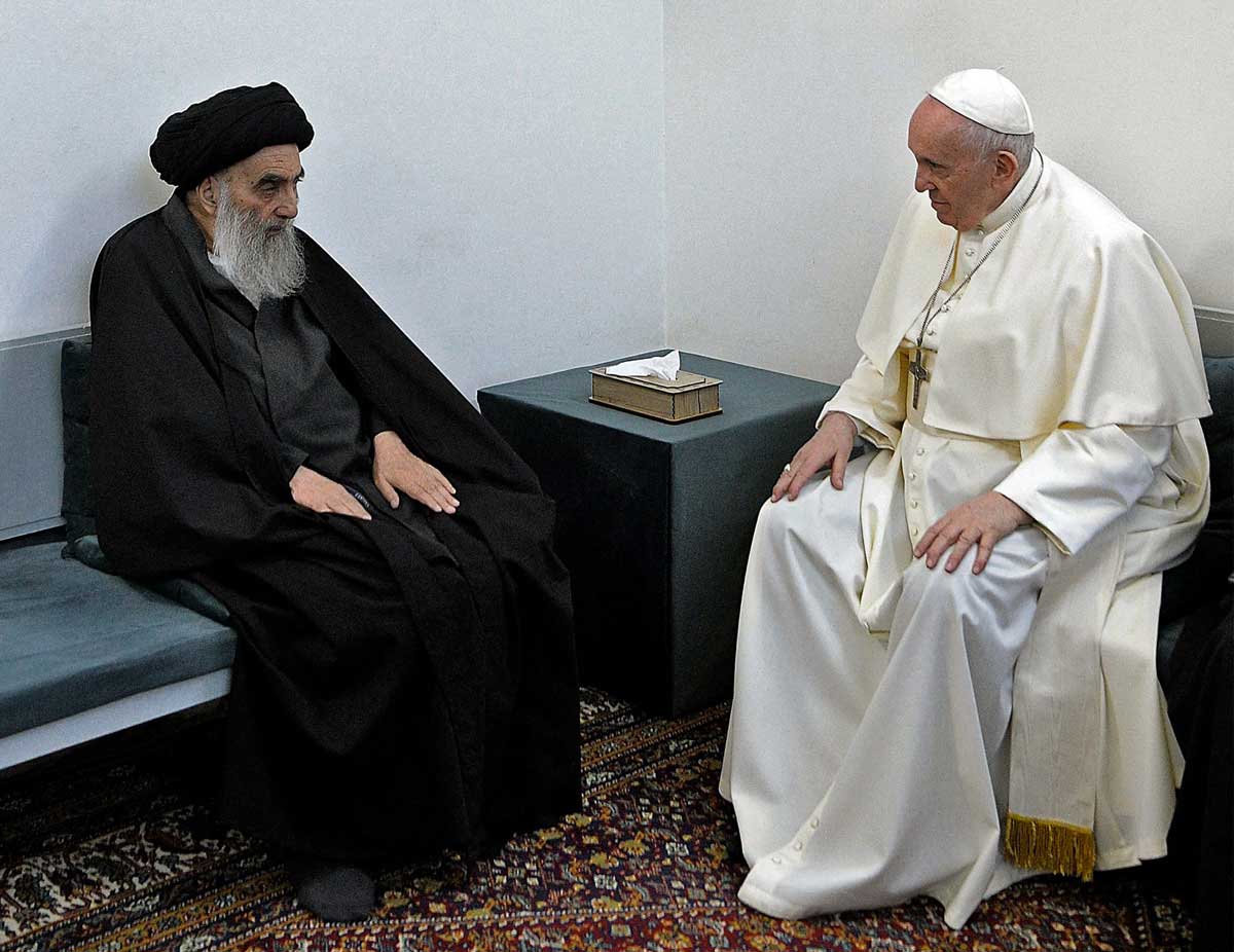 Prima, il papa aveva incontrato a Najaf il Grande Ayatollah Sayyid Ali Al-Husayni Al-Sistani, la massima autorità religiosa degli sciiti. Durante la visita, durata circa quarantacinque minuti, Bergoglio ha sottolineato “l’importanza della collaborazione e dell’amicizia fra le comunità religiose perché, coltivando il rispetto reciproco e il dialogo, si possa contribuire al bene dell’Iraq, della regione e dell’intera umanità”.
