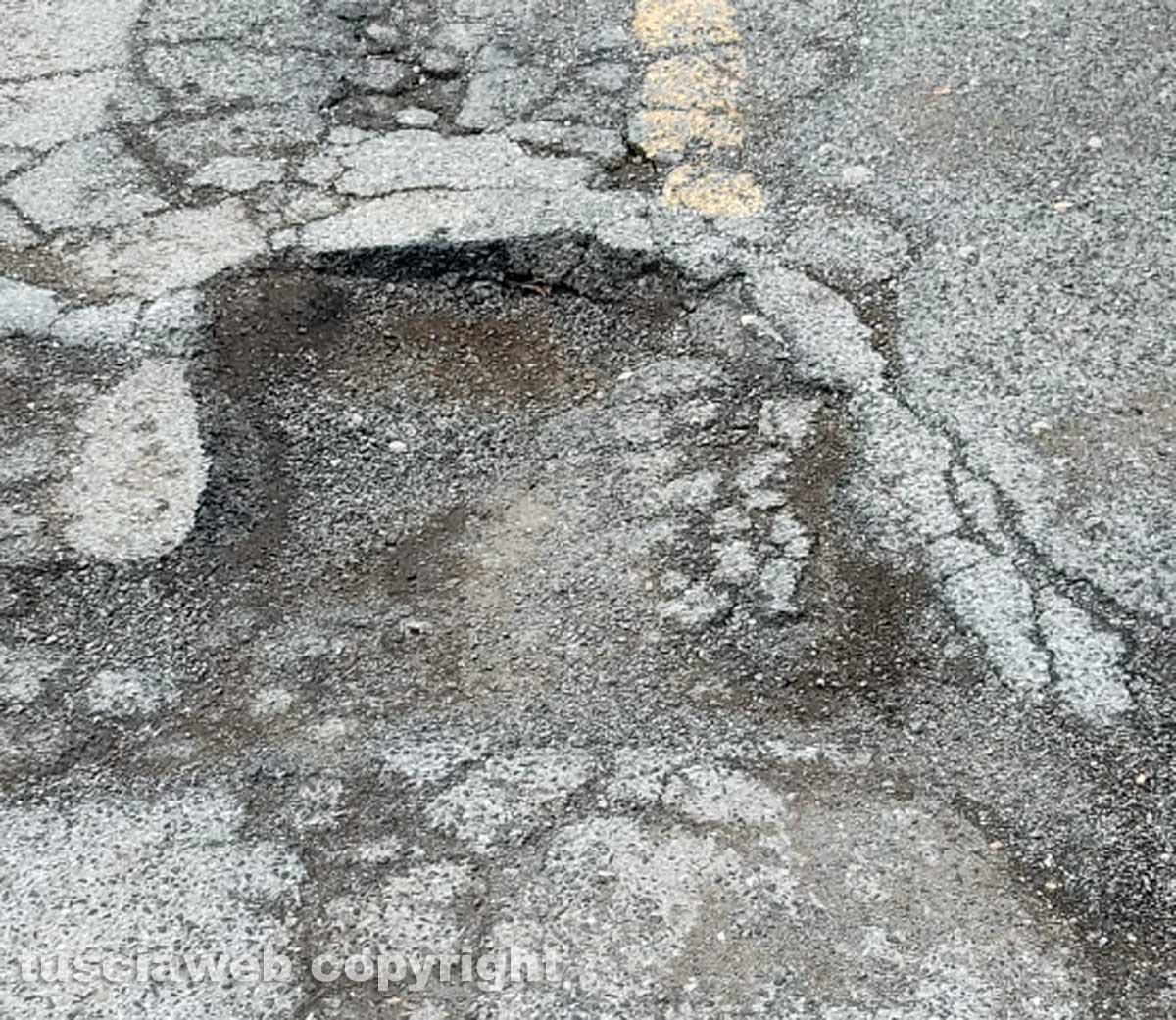 Viterbo – Riceviamo e pubblichiamo – Buonasera, vi volevo segnalare lo stato di degrado e di pericolosità di via Monti Cimini, questo cratere è davanti al civico 56.