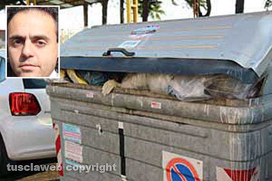 Il cassonetto di via Solieri dove è stato ritrovato il feto – Nel riquadro, l’avvocato Samuele De Santis