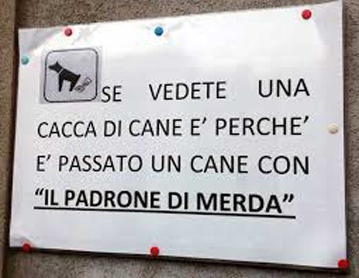 Viterbo – Riceviamo e pubblichiamo – Come era prevedibile, i soliti incivili che seguitano ad imperversare sul territorio cittadino lasciando a destra e a manca i “ricordini” dei loro cani, sono assistiti dai mancati controlli di chi dovrebbe attivarsi in tal senso, e nessuno affibbia loro salate multe che, in altri Comuni, dove le vigilanze sono all’ordine del giorno, hanno ridotto notevolmente tale incivile abitudine e mancanza di senso civico. Comunque, ad ogni buon conto, a questi screanzati è indirizzato un “affettuoso” manifesto che così riporta “Se vedete una cacca di cane, è perché è passato un cane con un “padrone di merda”.