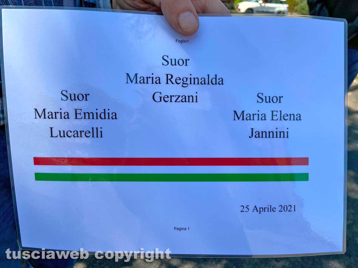 Una storia venuta fuori domenica scorsa durante le celebrazioni per l’anniversario del 25 aprile, festa della liberazione dal nazifascismo. Grazie ad Alessandro Mangiavacchi, figlio di Gino, ultimo comandante della banda, che domenica ha voluto rendere omaggio alle tre suore in largo Ferdinando Biferali al Carmine, vicino Pianoscarano. Con due targhe simboliche. Plastificate. Con i nomi delle suore e di Biferali. Messe, con un mazzo di fiori portato dall’Anpi e dalla Rete degli studenti, a ridosso del palo della luce che taglia in due il nome della piazza. Sfondo campo sportivo e le campagne dove comincia Castel d’Asso con i suoi braccianti e proprietari. Il tutto in solitaria e senza nemmeno uno squillo di tromba. “Una questione privata”, come il romanzo di Beppe Fenoglio.