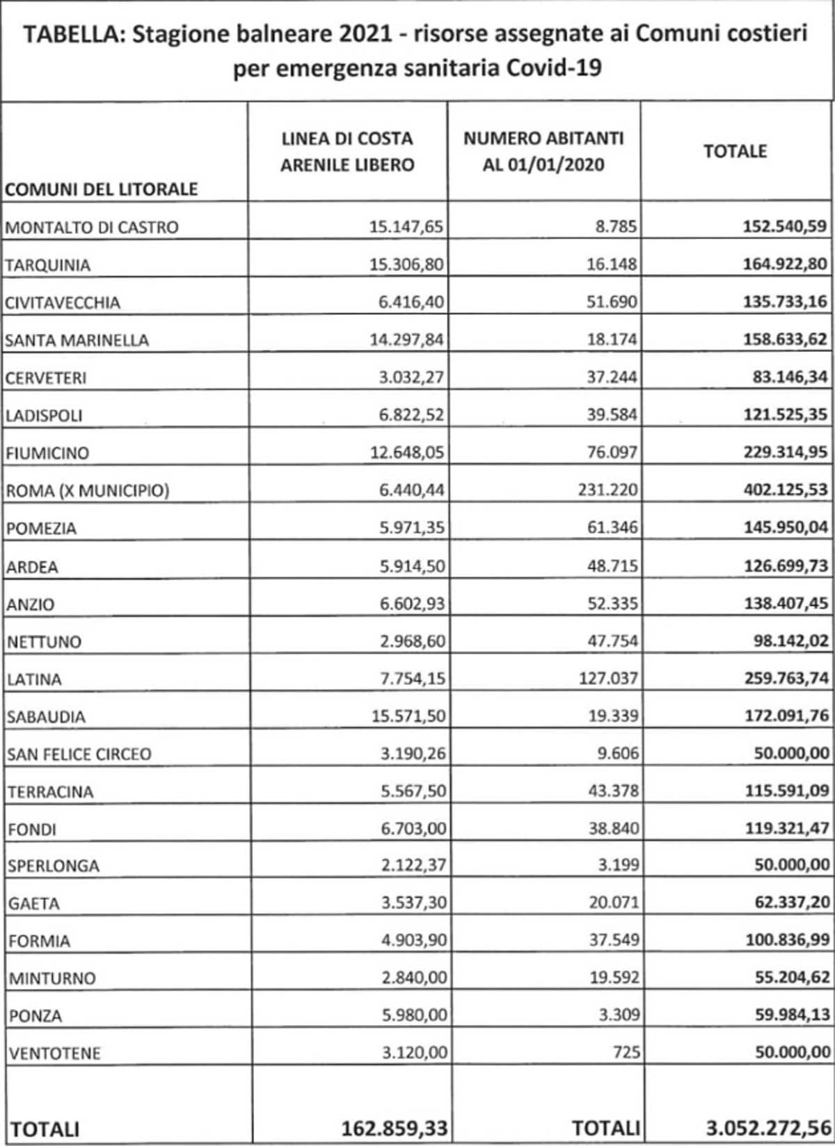 La somma verrà ripartita tra 21 Comuni costieri e 2 Comuni delle isole pontine, in funzione di due parametri: la popolazione e la lunghezza di arenile libero – ossia delle spiagge libere e libere con servizi – del loro territorio. Le somme spettanti a ciascun ente locale, almeno 50.000 euro, sono riportate nella tabella allegata.