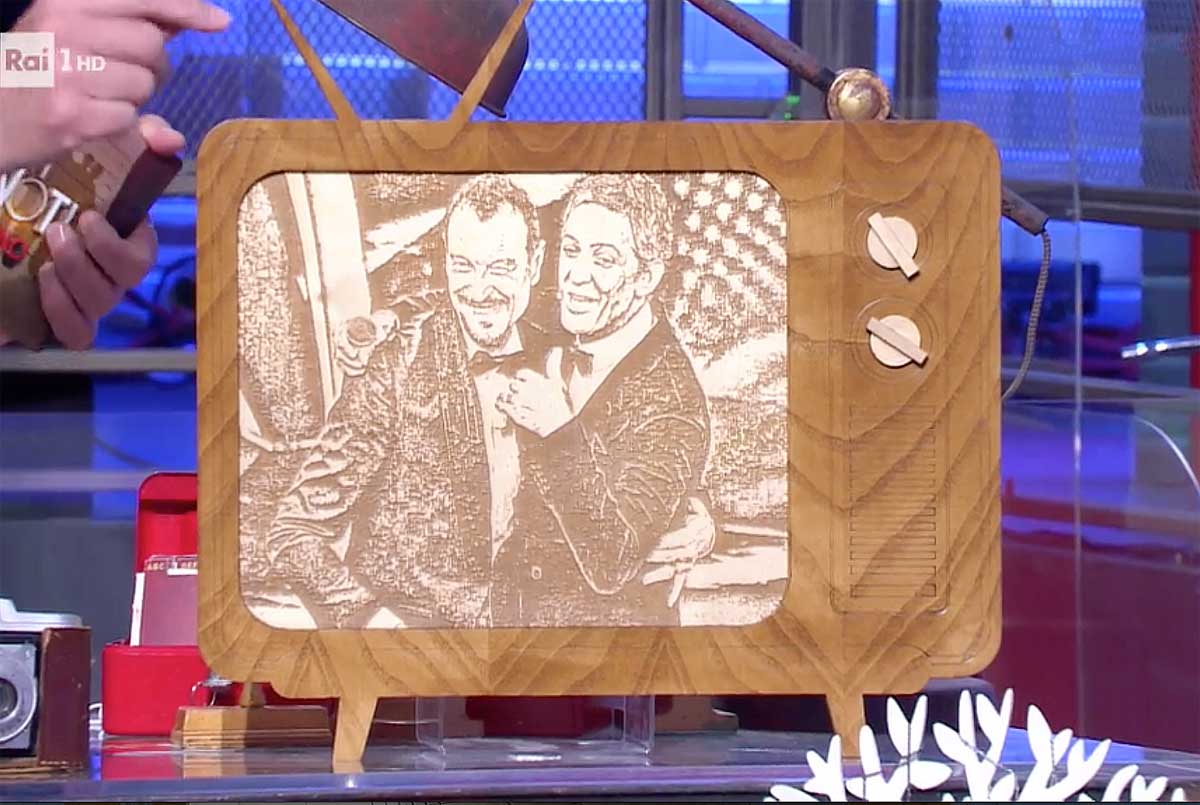Passando dal grande al piccolo schermo, Marco ha regalato ad Amadeus un originale oggetto, una cornice in legno a forma televisione, dove al centro campeggiava il conduttore insieme a Fiorello, al Festival di Sanremo. Realizzato al laser.