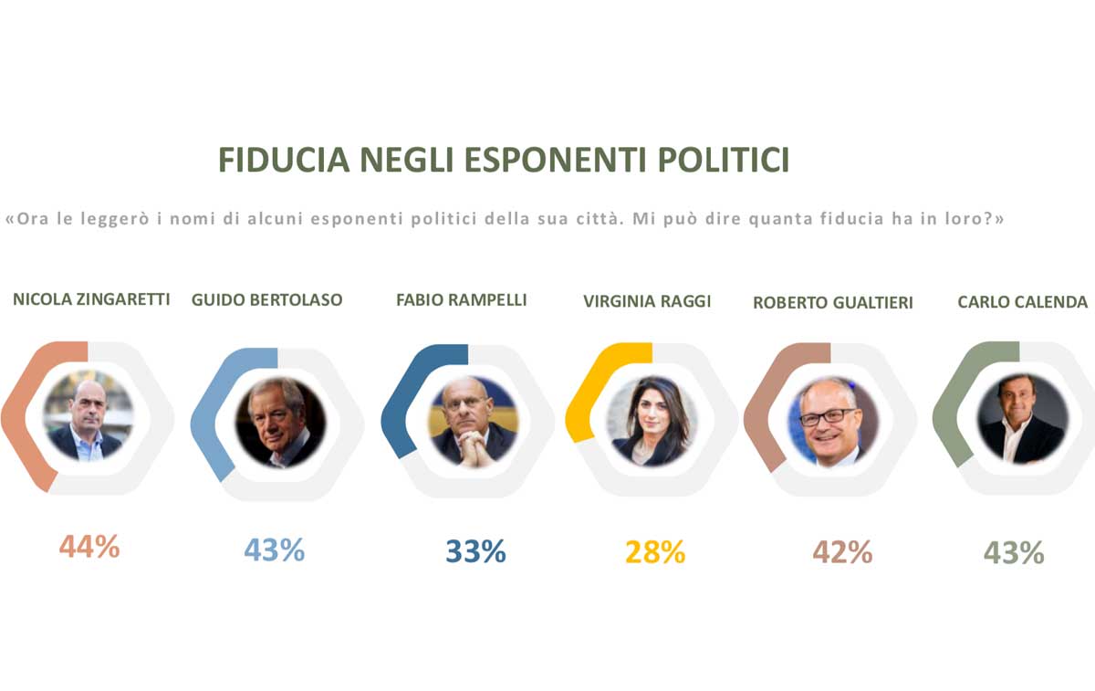 Abbiamo sondato il tasso di conoscenza e fiducia di alcuni esponenti politici. Ad eccezione di Fabio Rampelli (conoscenza 51%), i nomi sondati sono molto noti ai romani. Nello specifico: Gualtieri (79%), Calenda (87%), Bertolaso (94%), Zingaretti e Raggi (99% ognuno). Zingaretti risulta inoltre essere il politico di cui i romani più si fidano (44%), seguito a pari merito da Bertolaso e Calenda (43%), Gualtieri (42%), Rampelli (33%) e a chiudere Raggi (28%)