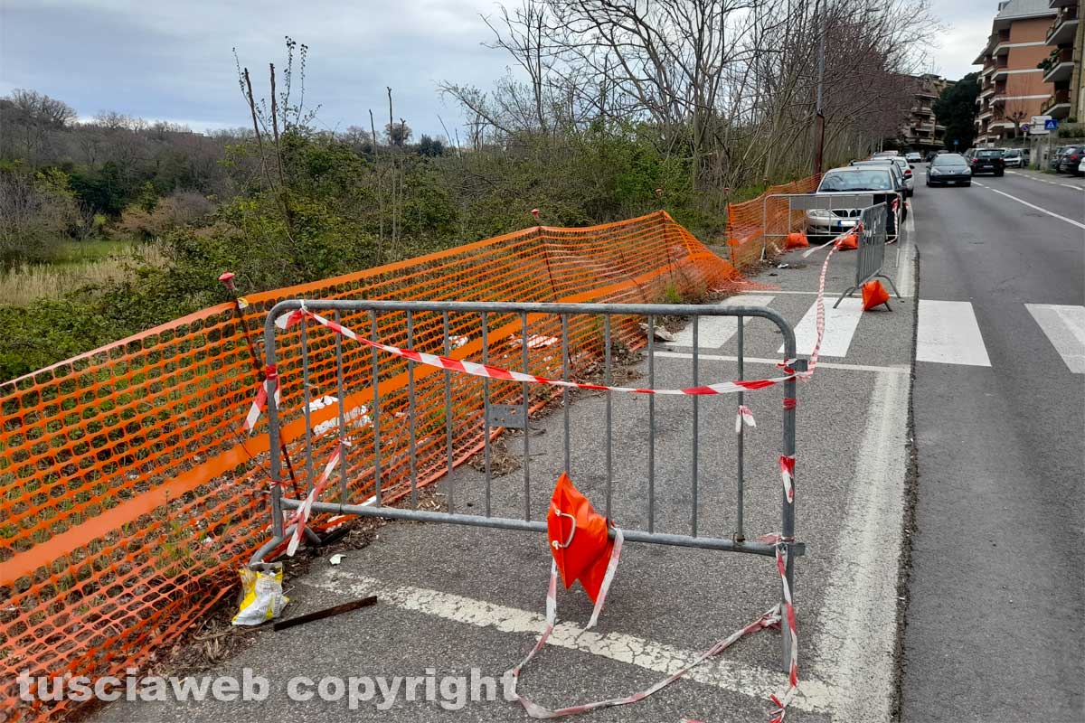 Via Belluno, una delle principali arterie del capoluogo. Da mesi interi, il marciapiedi prospiciente la scarpata sulla Valle dell’Arcionello è transennato e completamente interdetto alla fruizione pedonale, per circa 250 metri.