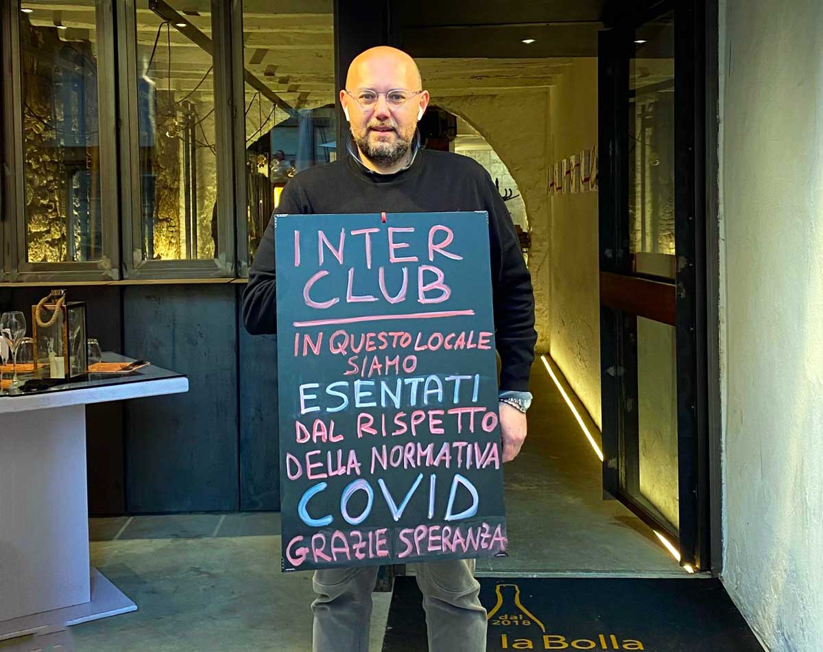 Viterbo – “Vogliamo fare anche noi come i tifosi dell’Inter ed essere esentati dal rispetto della normativa Covid…”. Il senso di poche e testuali parole. “Inter club. In questo locale siamo esentati dal rispetto della normativa Covid. Grazie speranza”. Su una lavagnetta nera, in rosso e in blu. A scriverle, Paolo Bianchini, presidente di Mio Italia, associazione di categoria di ristoratori e non solo, e proprietario del Vecchio orologio lungo via dell’Orologio vecchio a Viterbo.