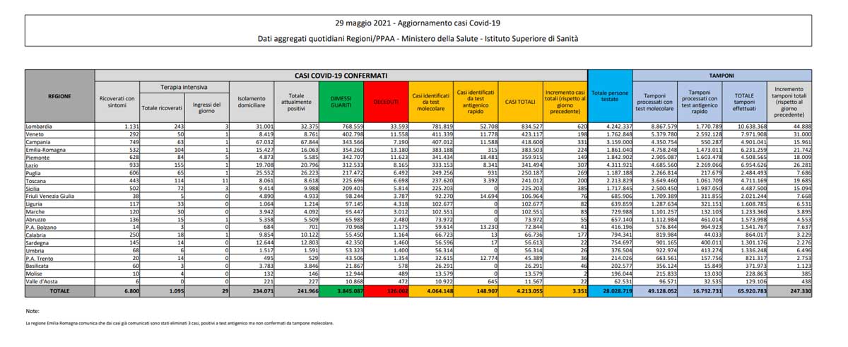 Coronavirus – Il bollettino del ministero della salute del 29 maggio 2021 – Clicca per ingrandire