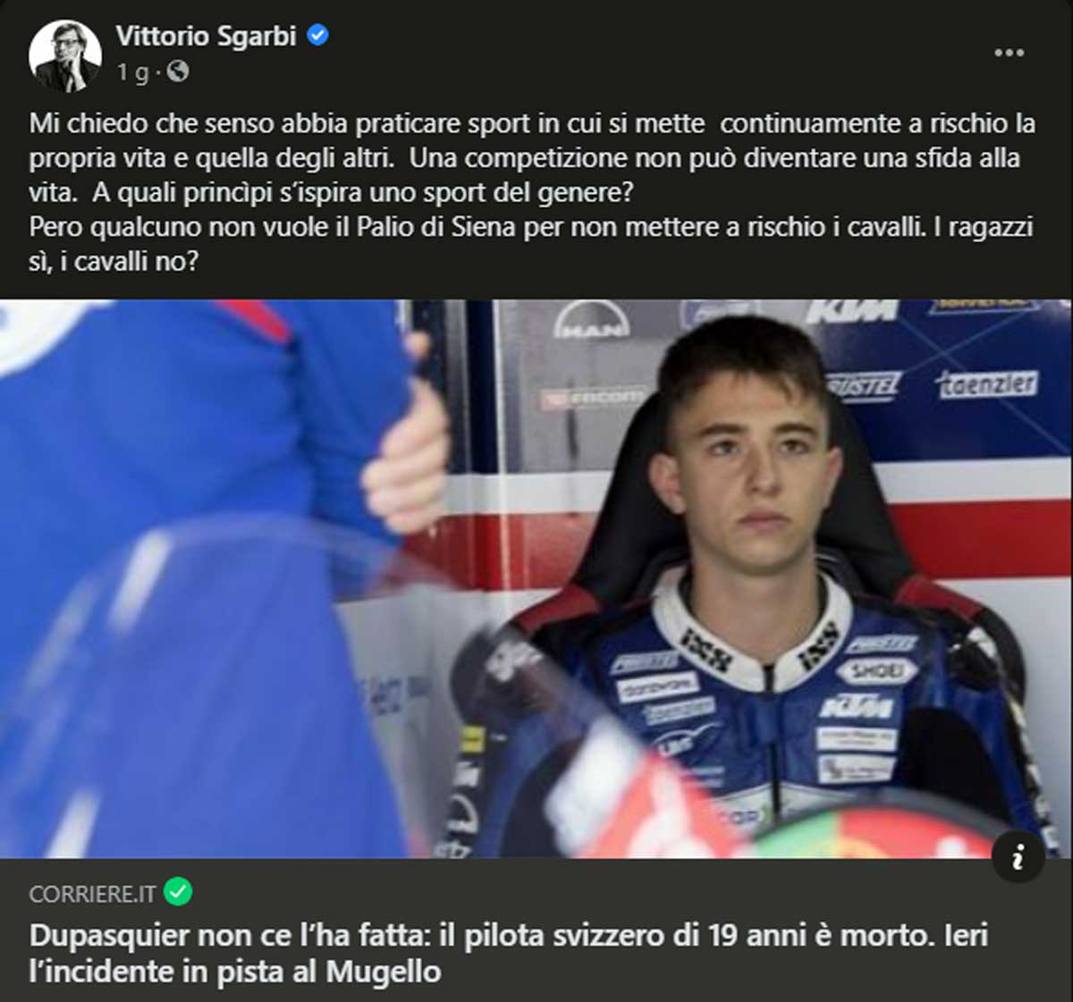 Roma – “Mi chiedo che senso abbia praticare uno sport in cui si mette continuamente a rischio la propria vita e quella degli altri. A quali principi s’ispira?”. Polverone per le parole pubblicate su Facebook da Vittorio Sgarbi in seguito alla notizia della morte di Jason Dupasquier, il 19enne svizzero deceduto per una caduta di gruppo durante le prove del mondiale Moto3 al Mugello.