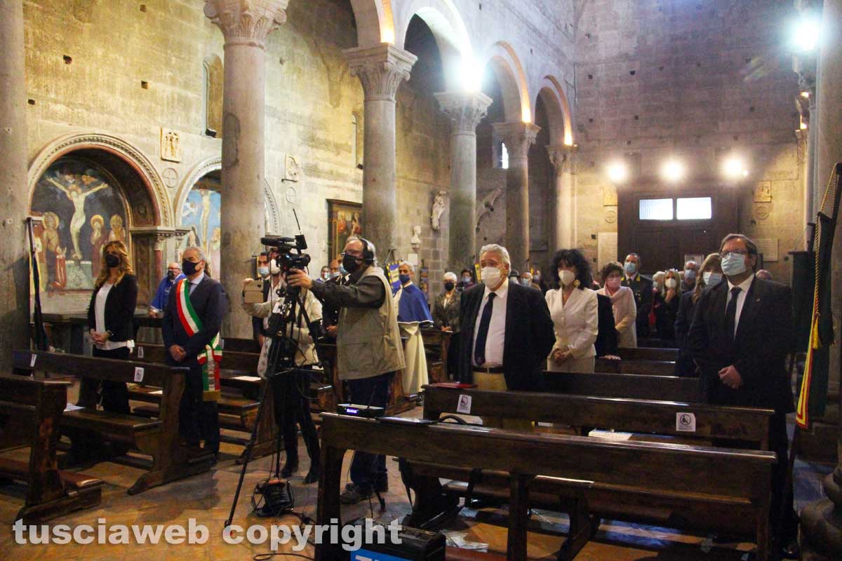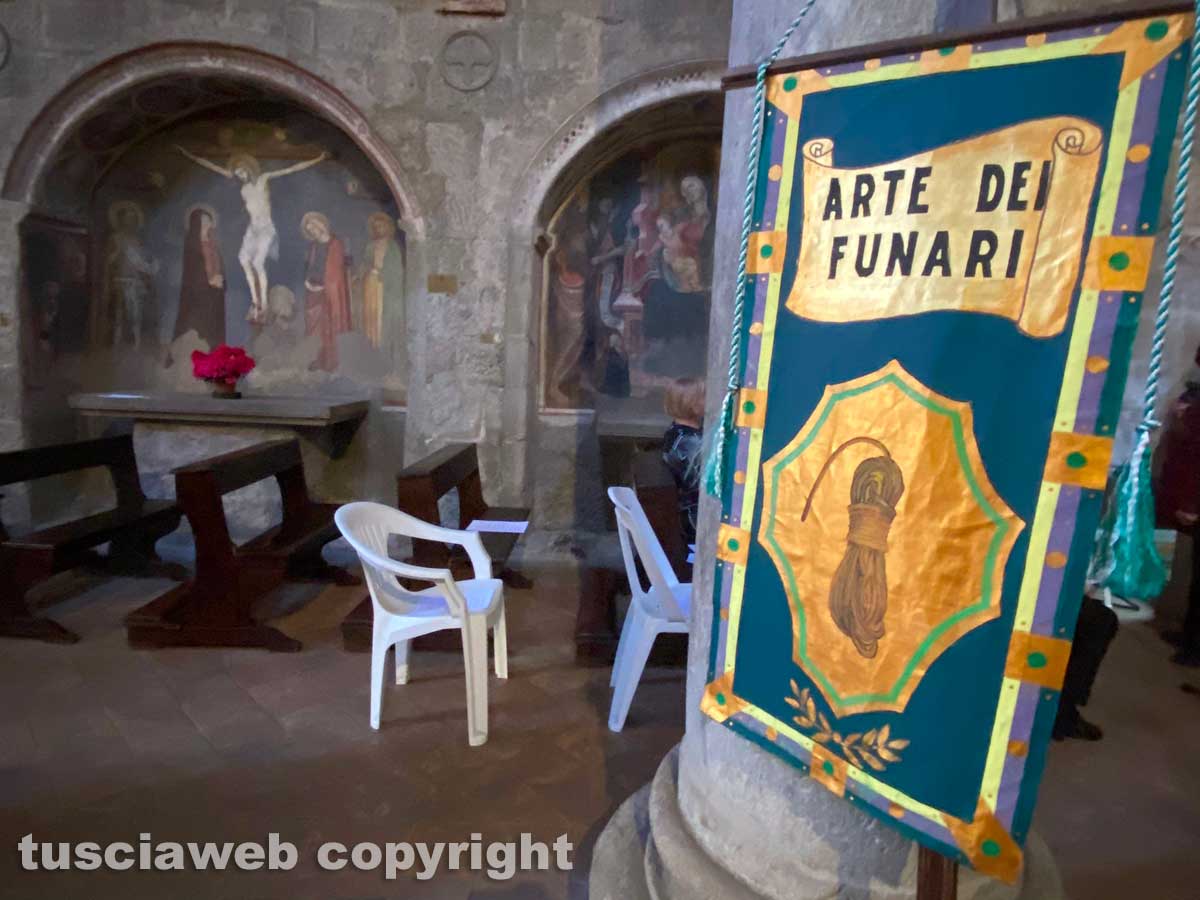 In chiesa, ai lati gli affreschi del trecento restaurati pochissimi anni fa, ci sono il sindaco di Viterbo Giovanni Arena, l’assessora regionale Alessandra Troncarelli, gli assessori comunali Ludovica Salcini e Marco De Carolis, il capogruppo Giulio Marini, il comandante provinciale dei carabinieri Andrea Antonazzo, Alessandra Cortese e Alfonso Carnevalini del comitato festeggiamenti. Ci sono poi le confraternite, il coro, una rappresentanza del corteo storico e tutti i gonfaloni di arti e mestieri che avrebbero dovuto sfilare in corteo. Come due anni fa. Prima del Covid. In fondo alla chiesa il Santissimo Salvatore.