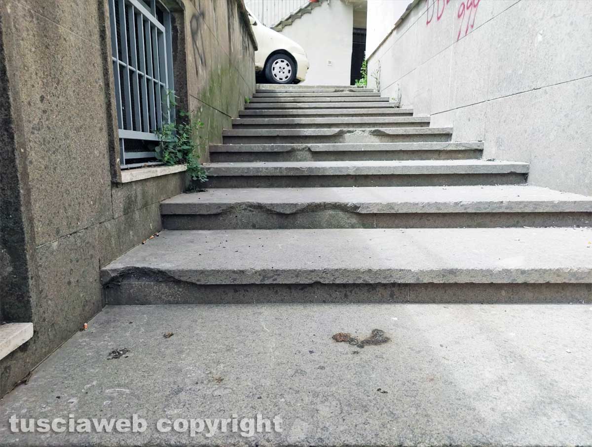 Viterbo – In alcune via tra il Sacrario e il quartiere San Faustino la puzza di urina e di escrementi si sente bene. Dietro al monumento ai caduti, ad esempio, in via Bellavista, tra via Santa Maria in Volturno e via Santa Maria Elisabetta. Ma a terra non ci sono solo chiazze di pipì e cacca. In due punti anche altrettante siringhe, con l’ago ancora inserito. Una sta lì, tra le erbacce che crescono su delle scalette, da almeno un paio di giorni. L’altra, sull’uscio delle abitazioni, fino a lunedì non c’era dicono i residenti. “L’ha vista stamattina (martedì, ndr) un operaio dopo averci messo il piede sopra. Per fortuna aveva gli scarponcini…”.